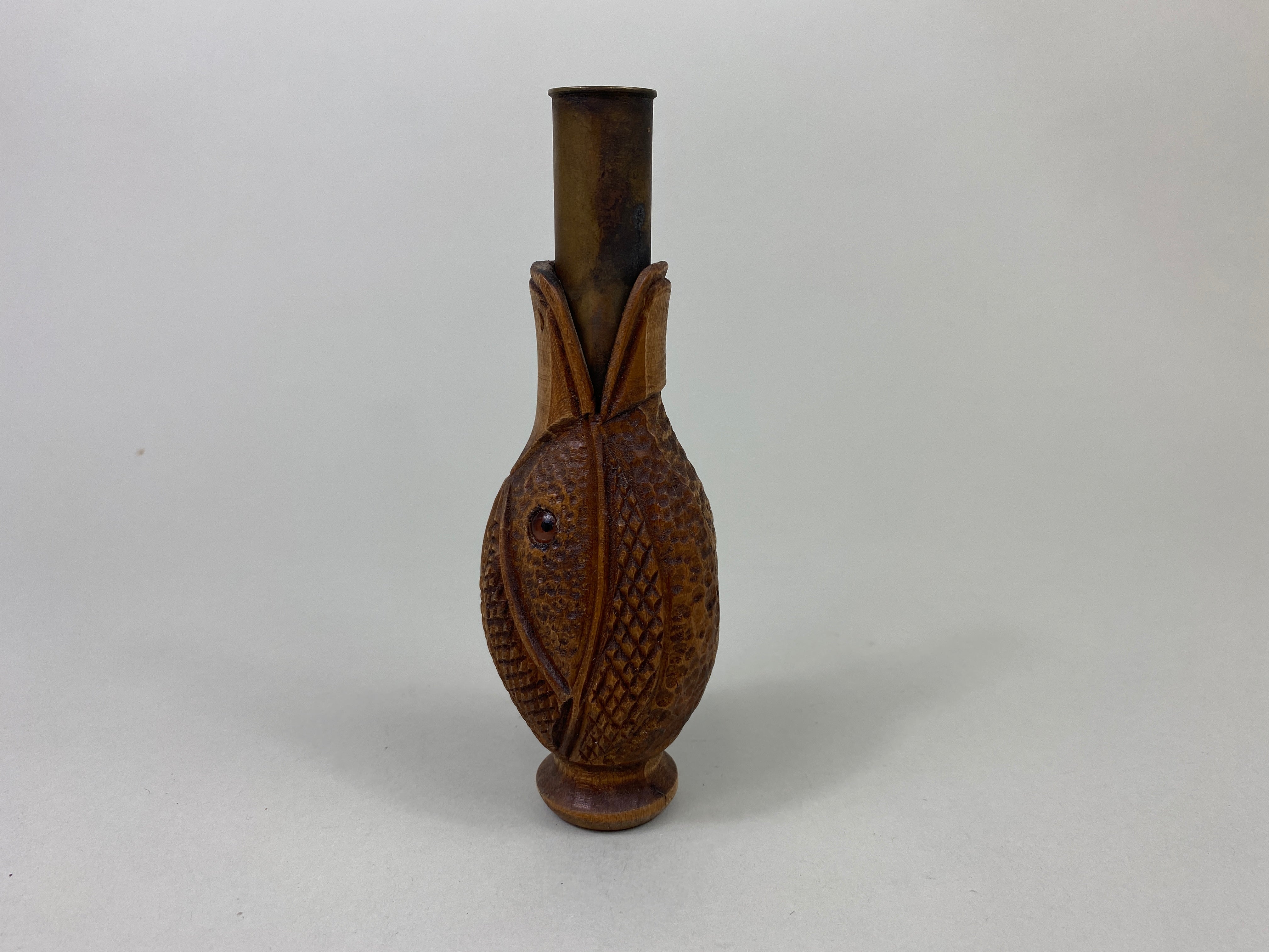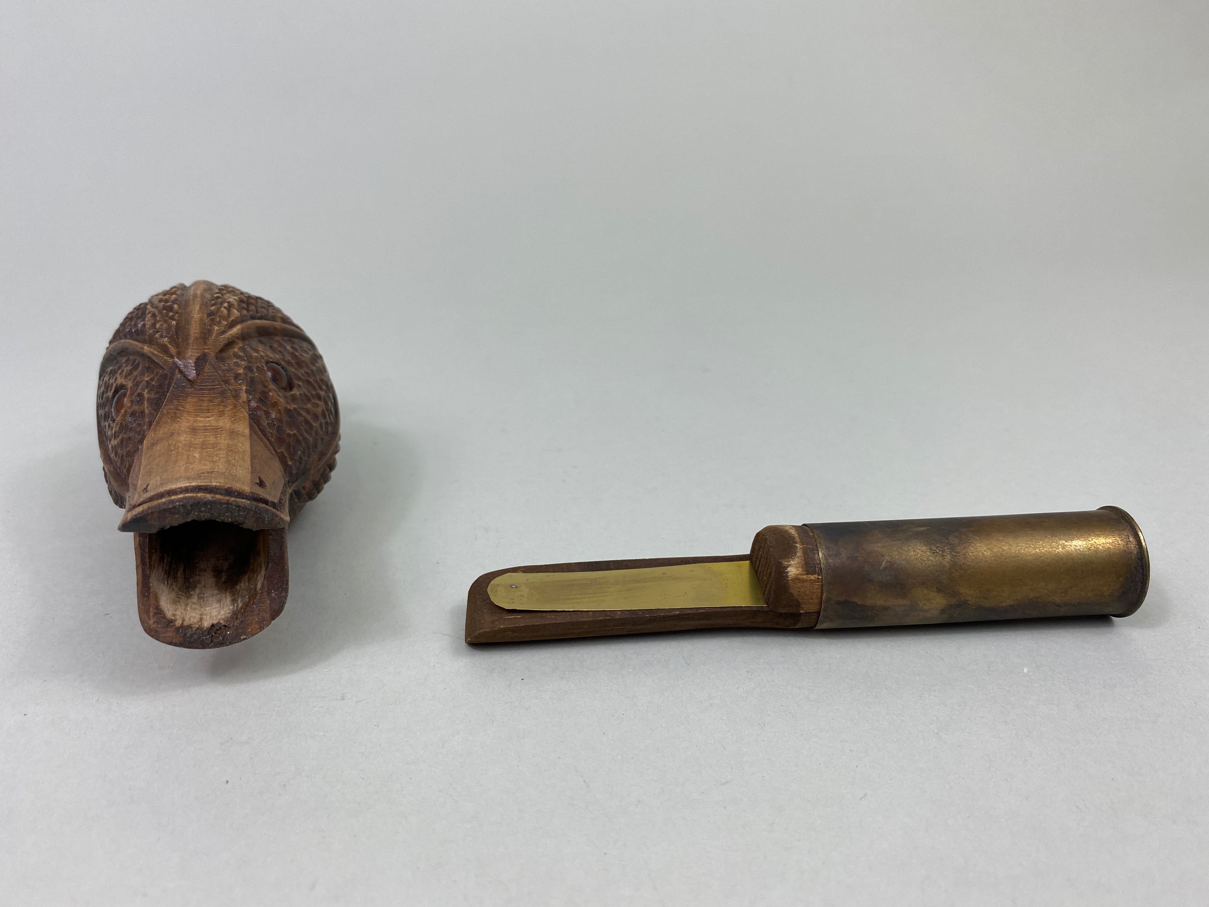Don Faigley Duck Head Shaped Duck Call, Lancaster, Ohio. Made in the style of Kinney & Harlow, call is checkered with detailed carving, has glass eyes, end of stopper is...