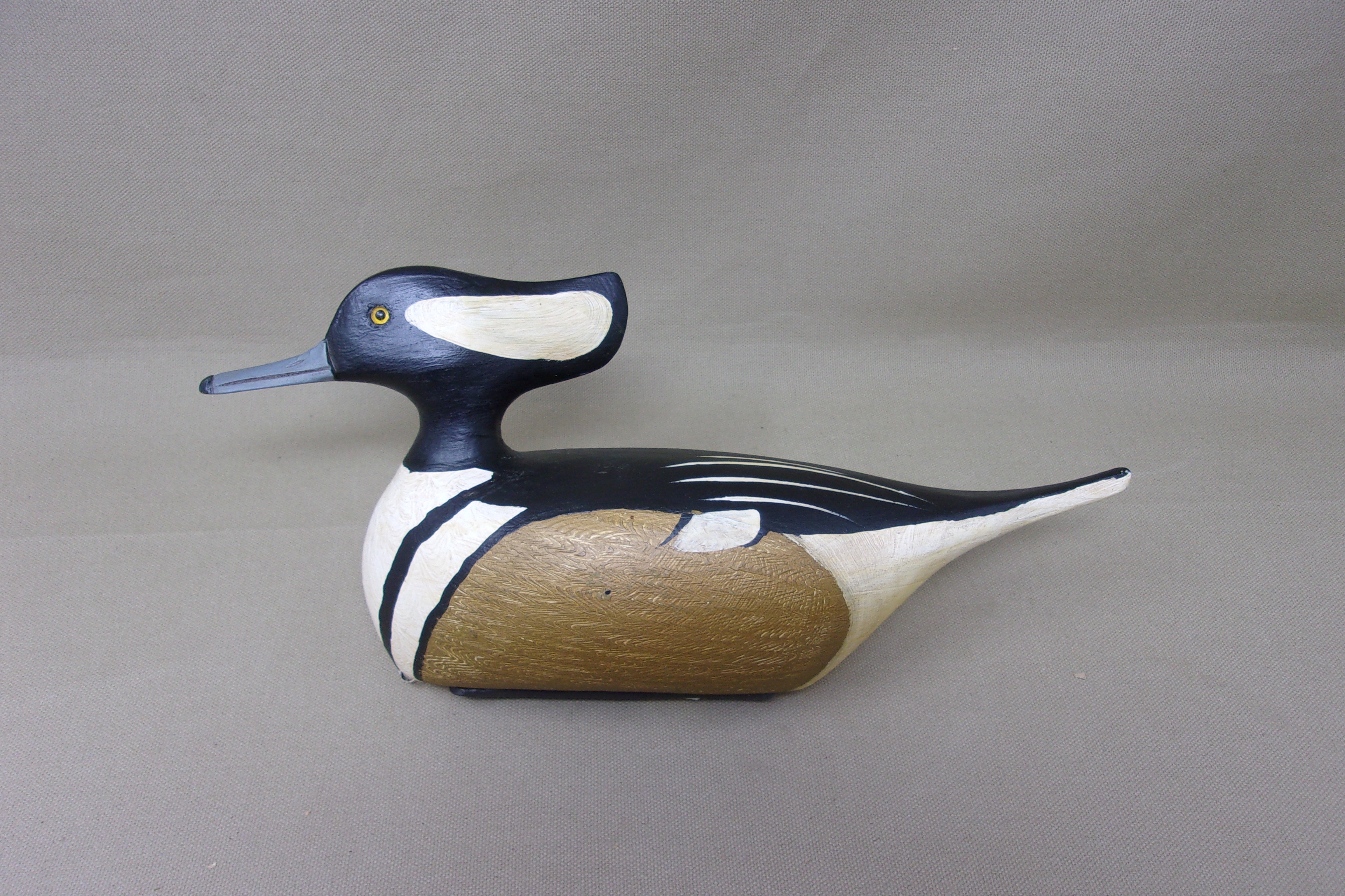 Pair of Hooded Mergansers by Jim Slack, Pekin Illinois.  Half size, both decoys have glass eyes, comb painting, rigging hooks, and carver's flat lead weights on bottom with "J.H.S.MAKER".  Very nicely done, each measure 11" long, 3" wide, and 5" tall.