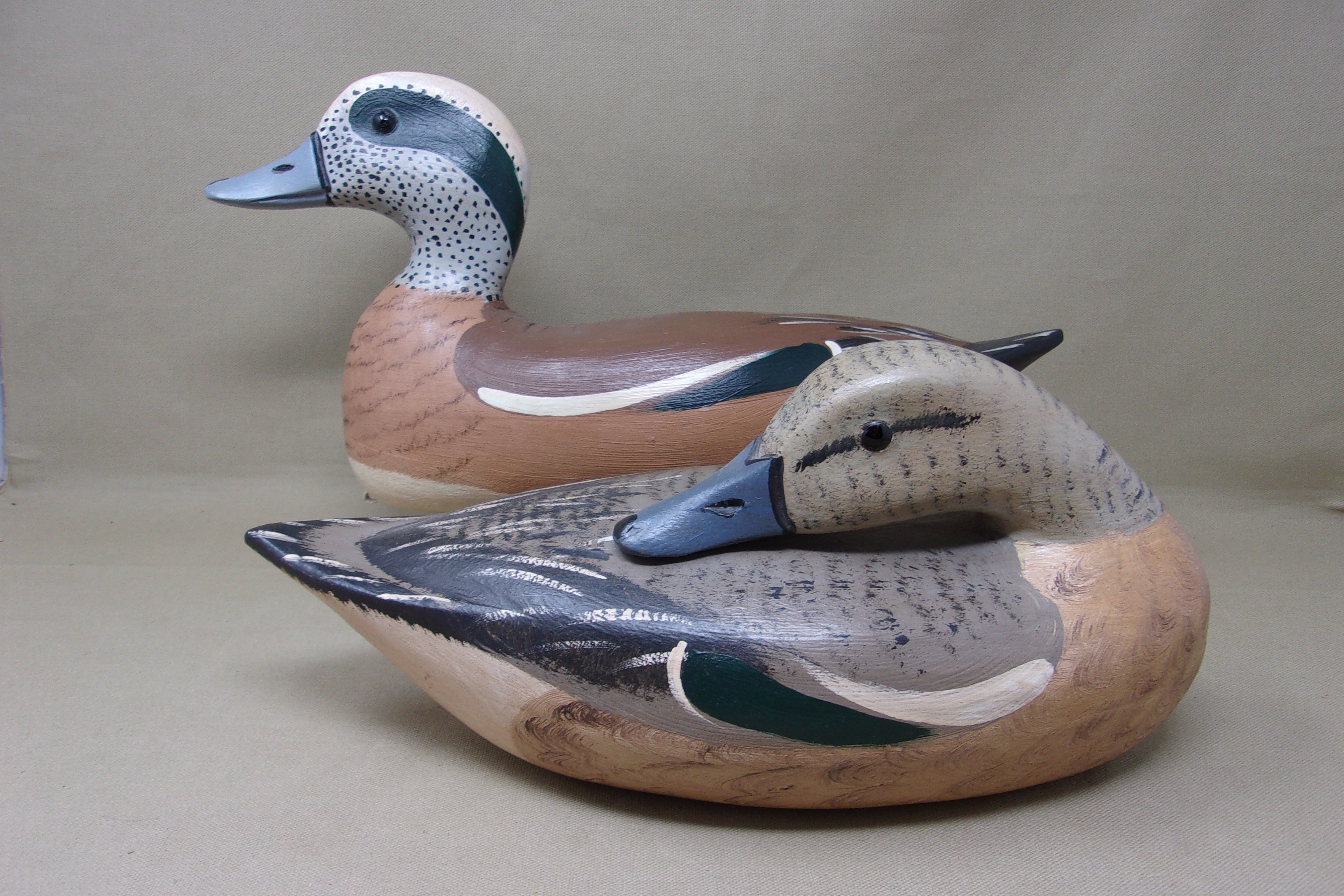 Pair of Widgeon by Slim Slack, Pekin Illinois. Preening Hen, both have glass eyes, hollow bodies, lead weights and rigging hook on bottom and are very nicely painted, good examples of this long time Illinois River carver. Decoys measure 13"-15" long, 5" wide, and 5"-7" tall.