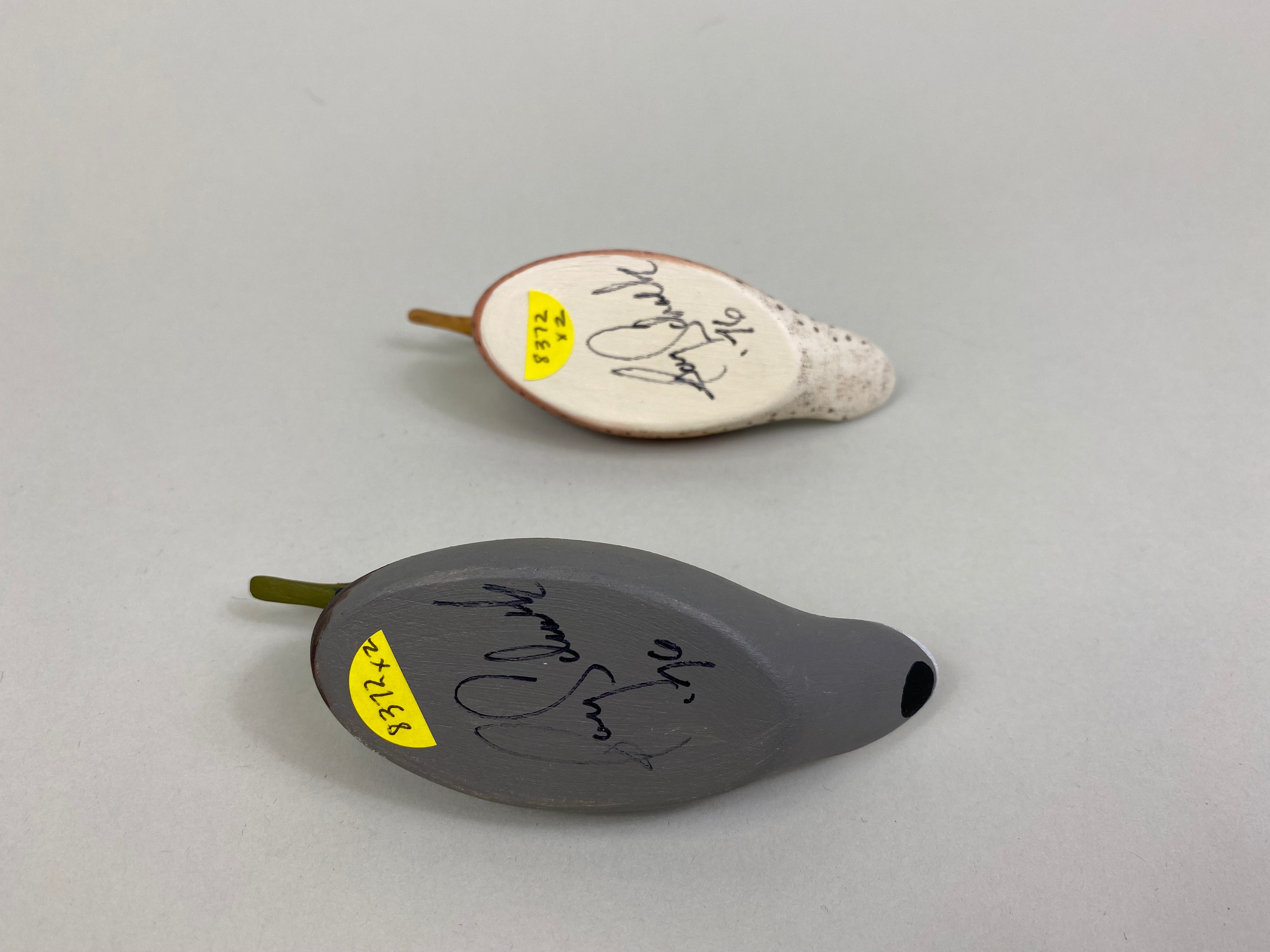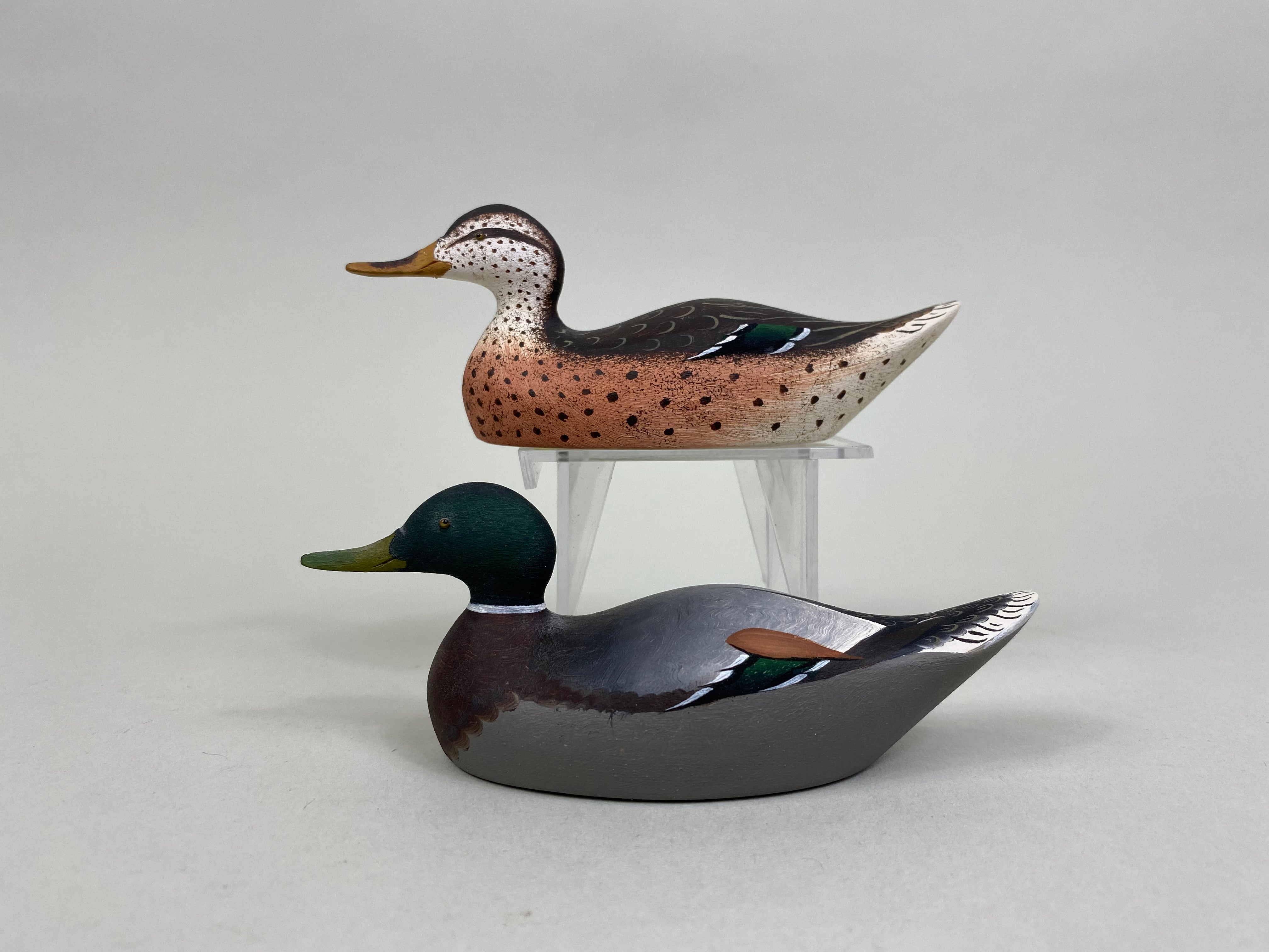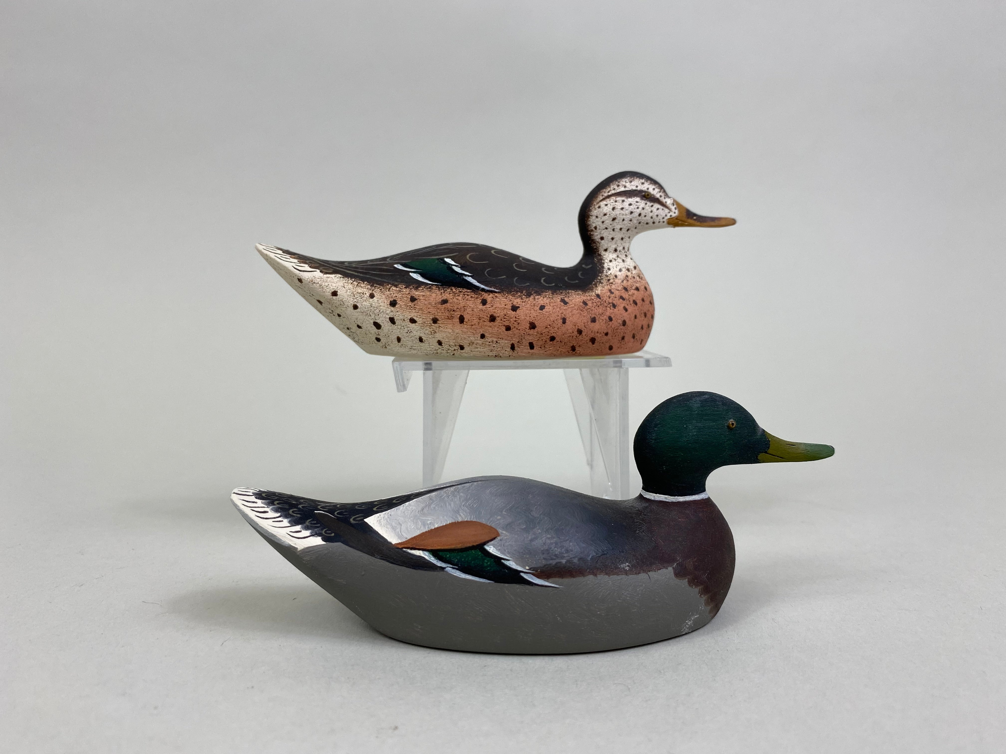 Pair of Miniature Mallards, Mason Style by Ray Schalk, Clemont Florida. Signed and dated 1976 on bottom, each measure 5" long, 1-1/2" wide, and 2" tall, very good condition.