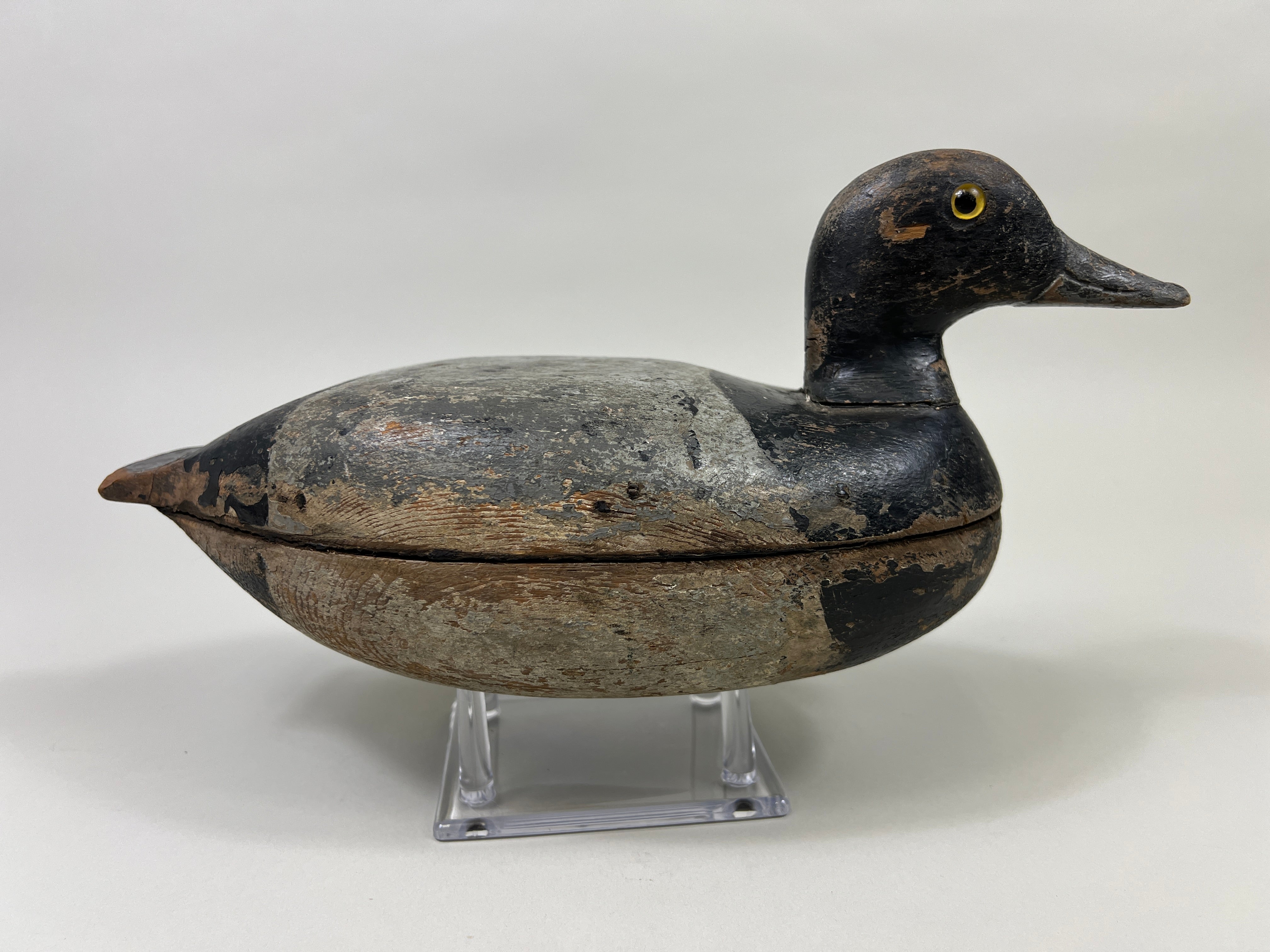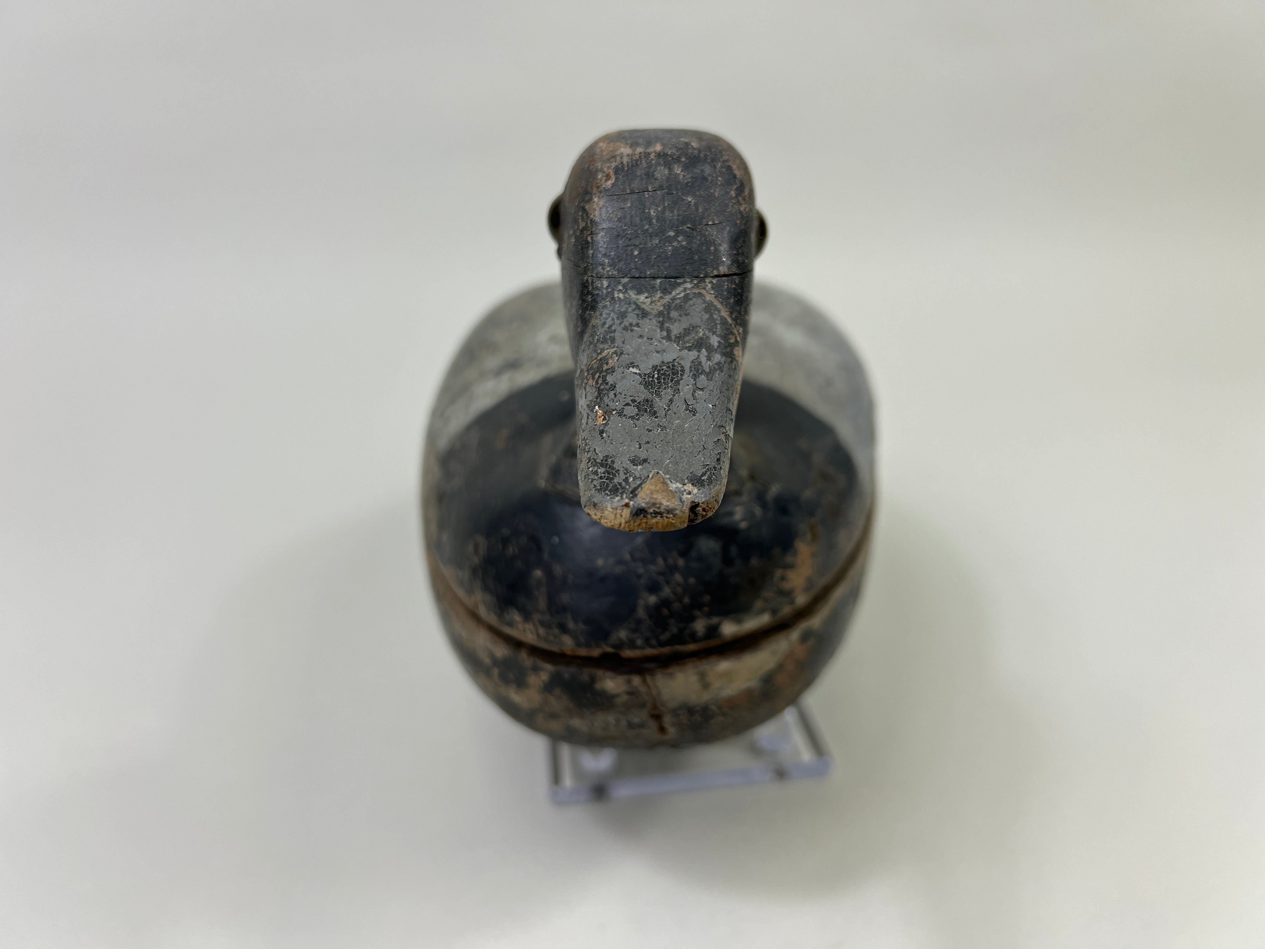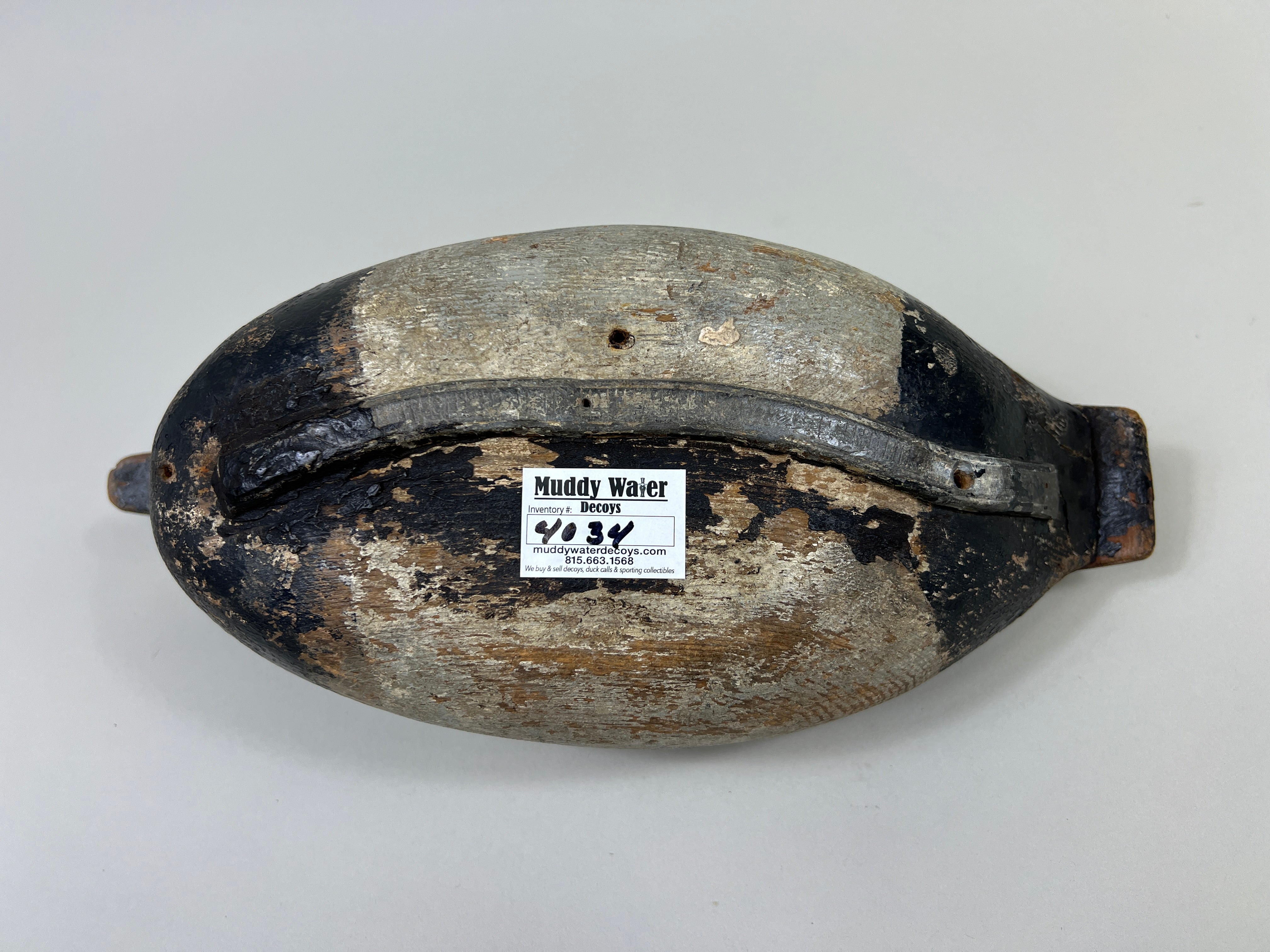 Unknown Illinois River Blue Bill. Glass eyes, hollow body, circa 1920's, age cracks and hunting wear, still has some of it's original paint. Measures 13" long, 5" wide, and 5-1/2"...