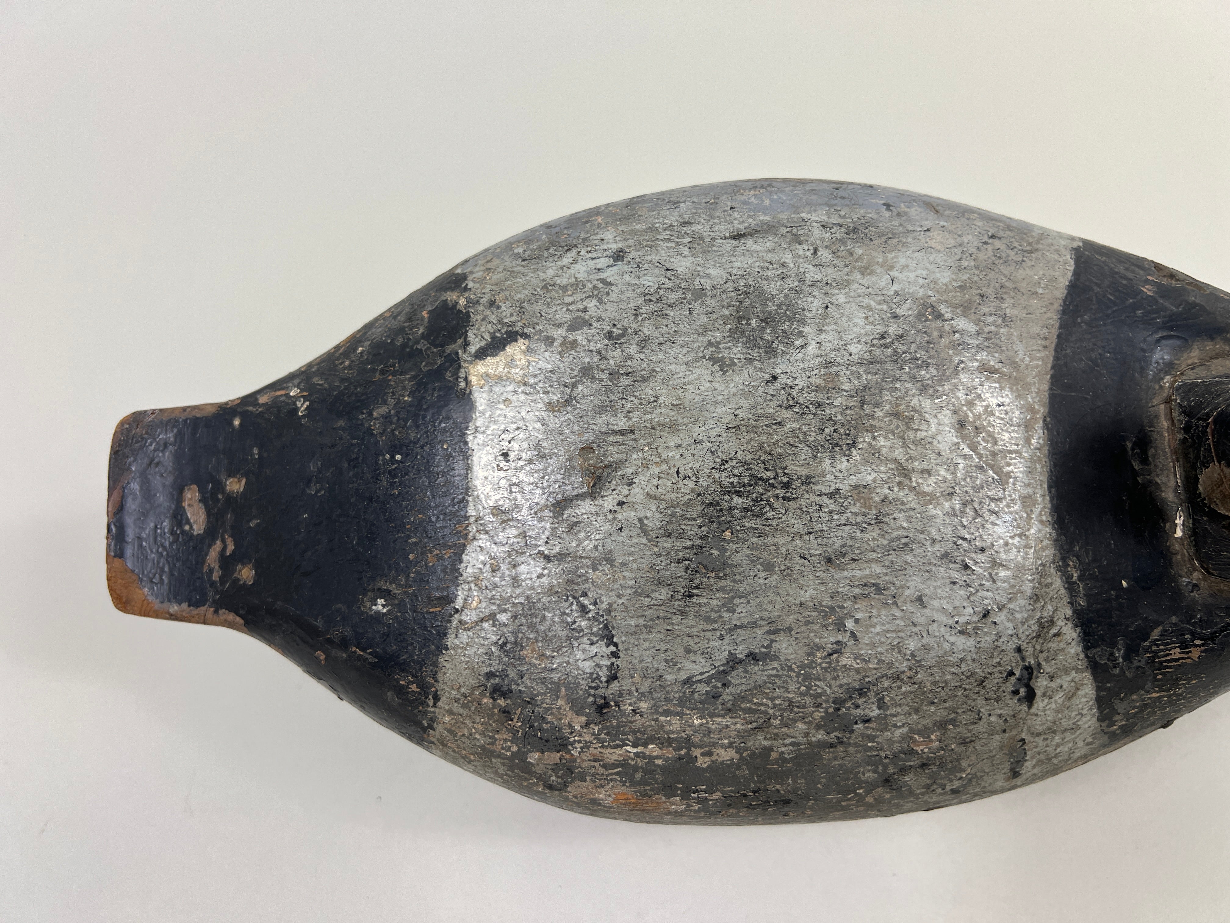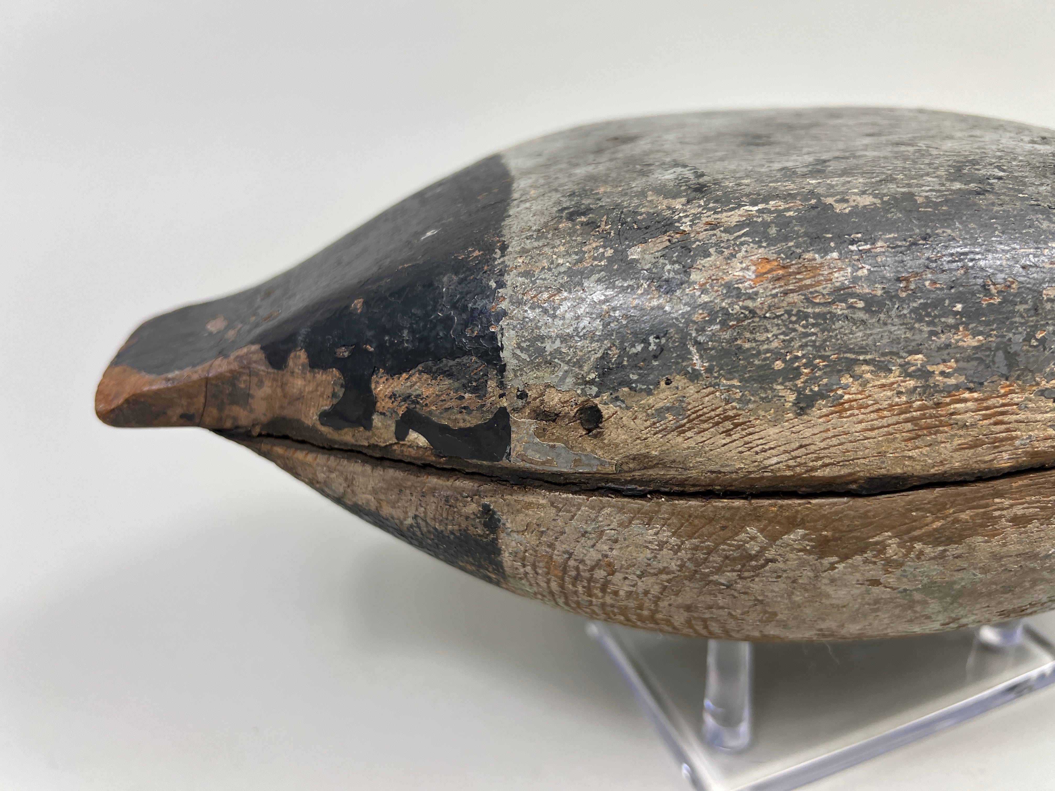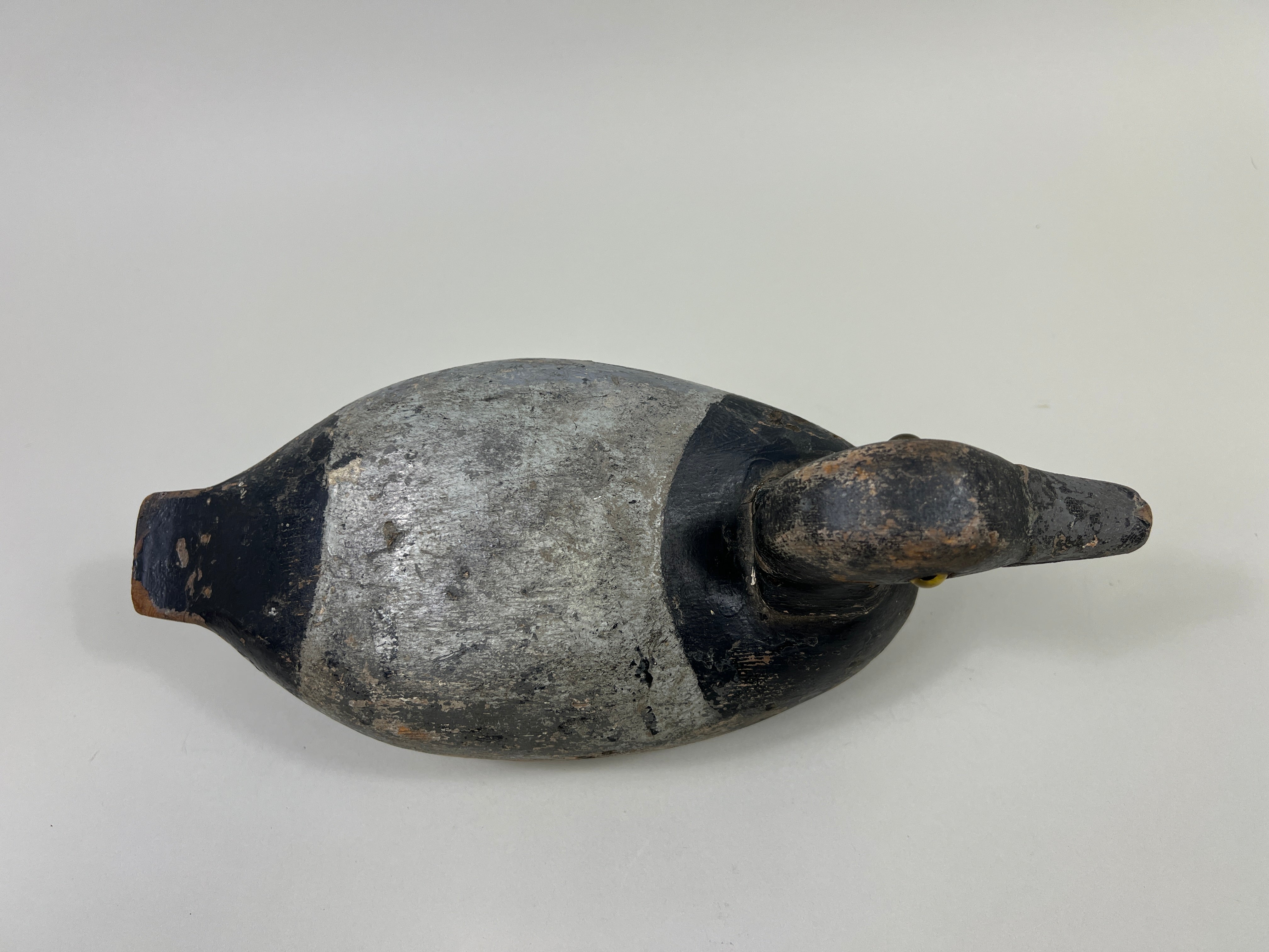 Unknown Illinois River Blue Bill. Glass eyes, hollow body, circa 1920's, age cracks and hunting wear, still has some of it's original paint. Measures 13" long, 5" wide, and 5-1/2"...