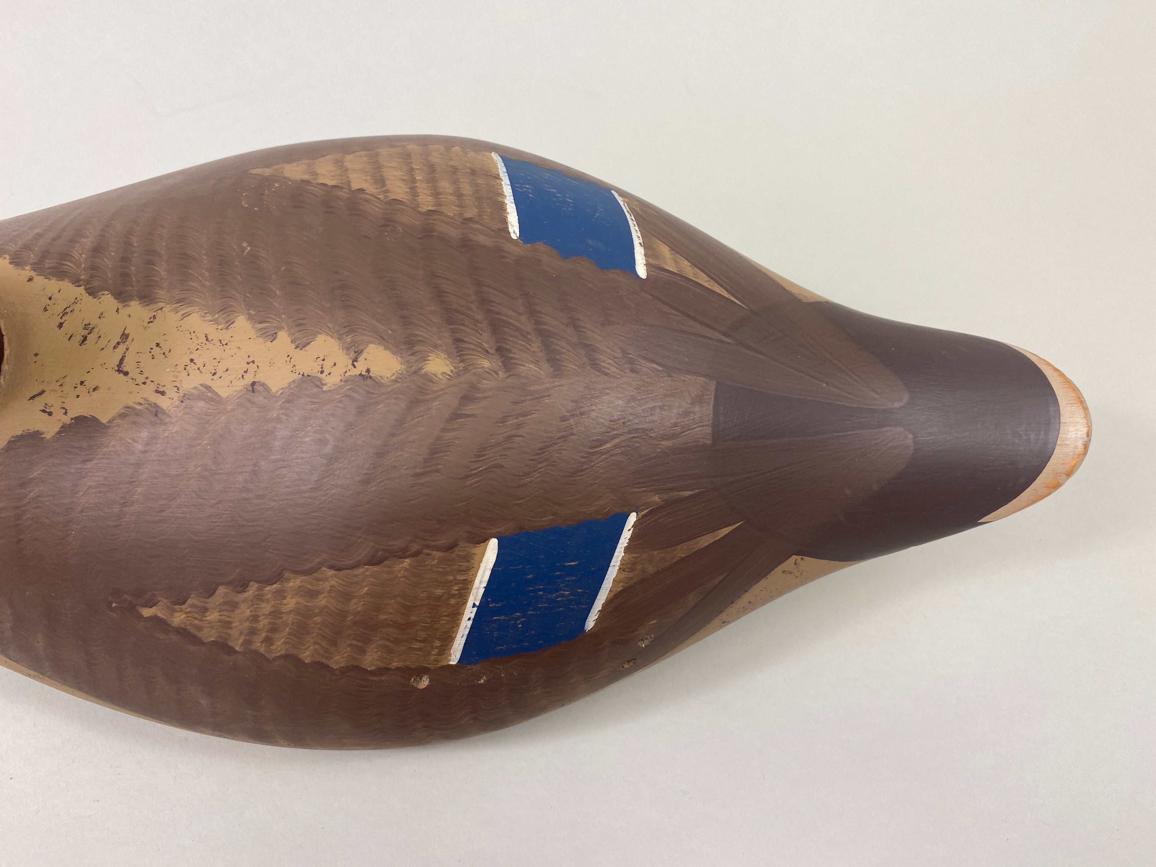 Captain Harry Jobes Mallard Hen, Havre de Grace, Maryland. Original paint, painted eyes, lead weight and leather rigging strap on bottom, solid body, BB marks, nails in neck, minor gunning...
