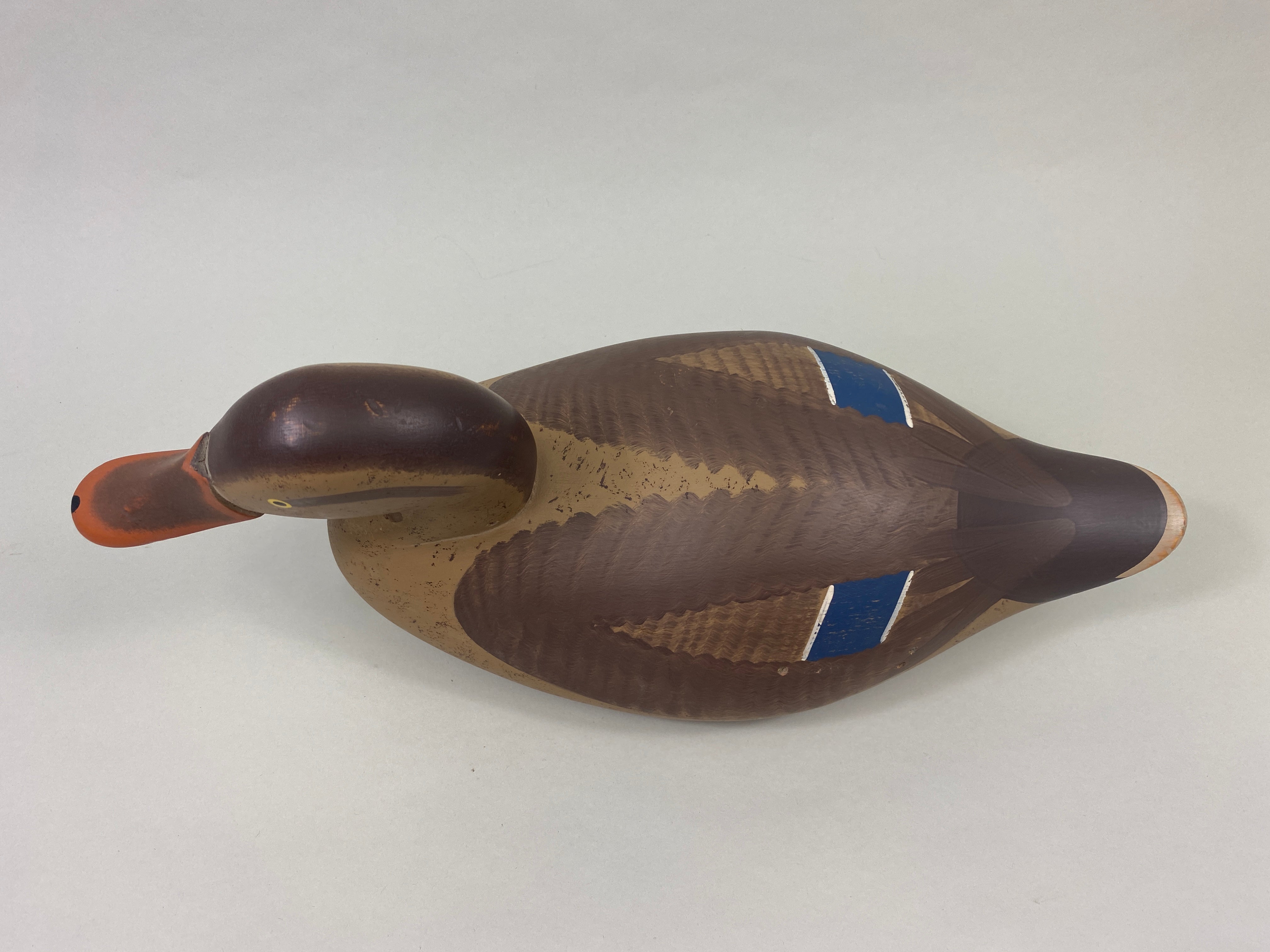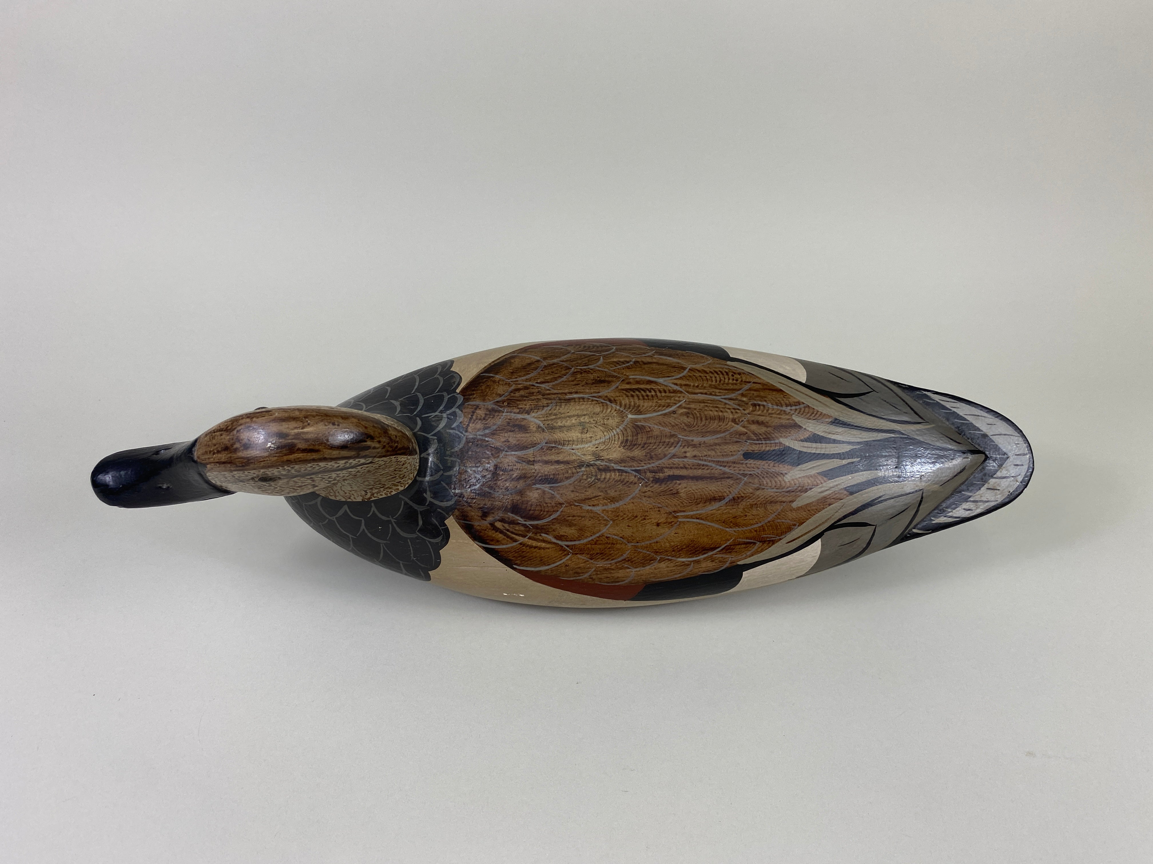 Jack Schwartz Gadwall Drake, Lacon, Illinois, repainted by Charlie Moore, Dekalb, Illinois. Glass eyes, hollow body, circa 1930's, "J" brand on bottom, has minor wear. Measures 17" long, 5" wide,...