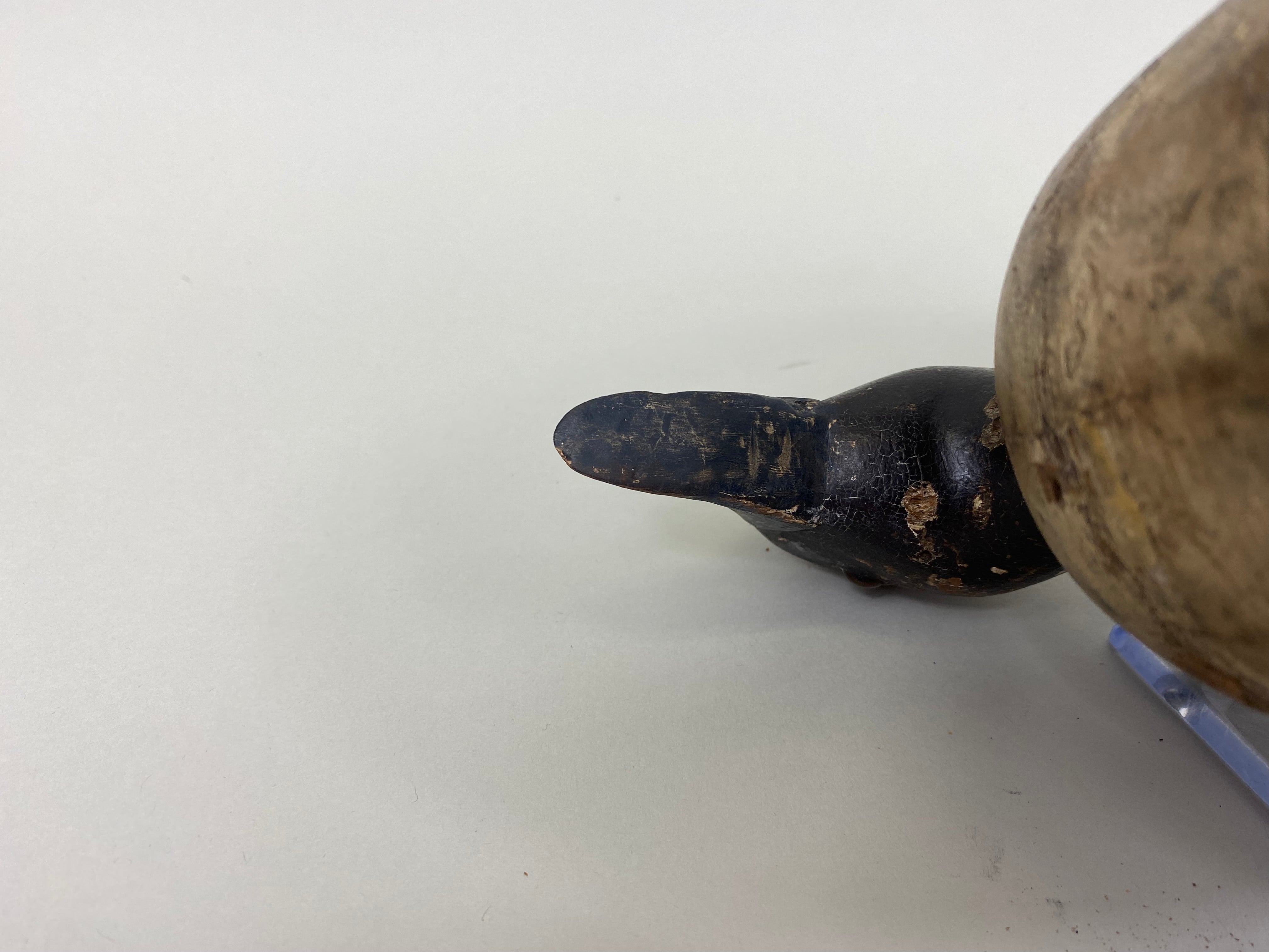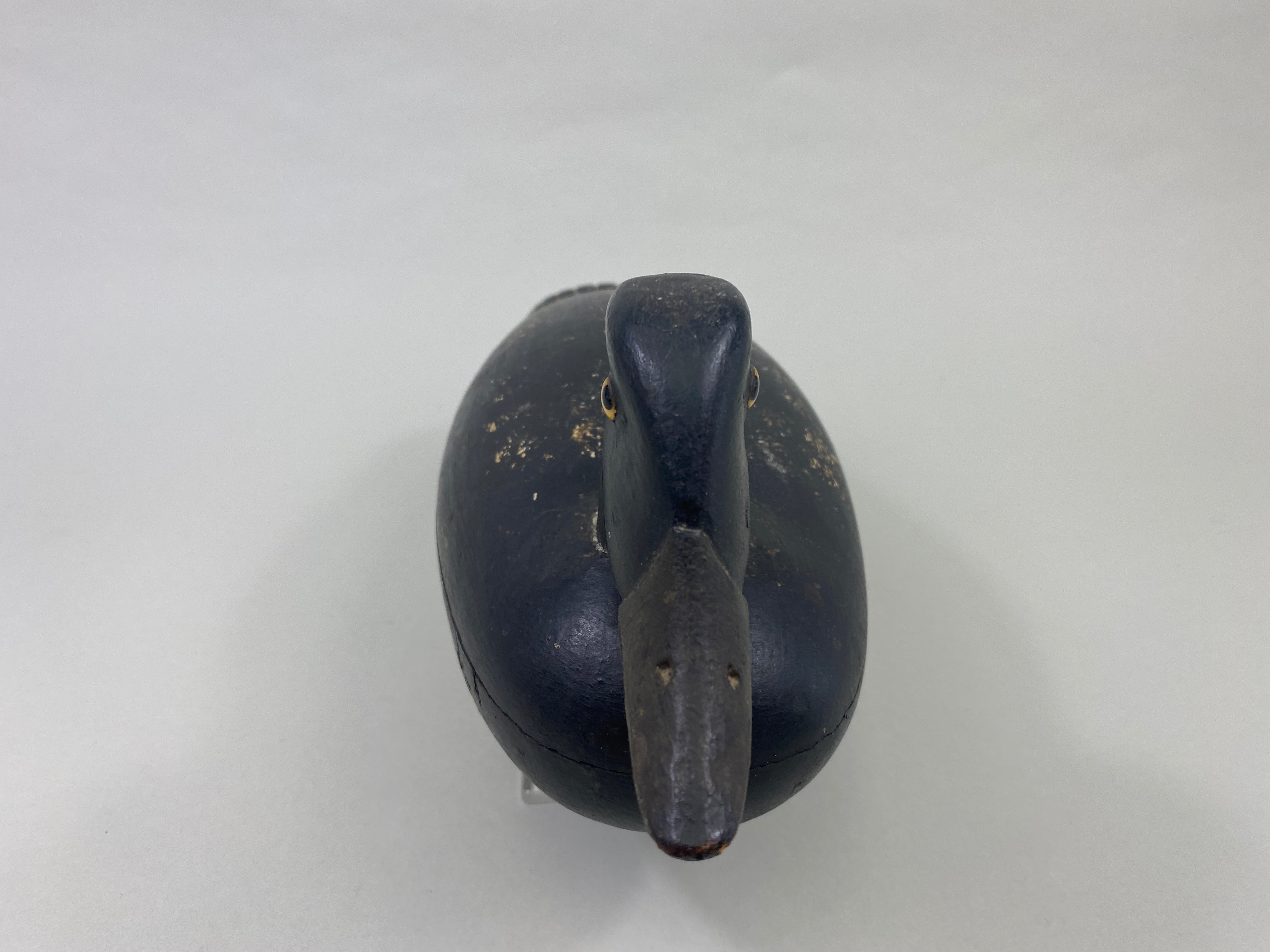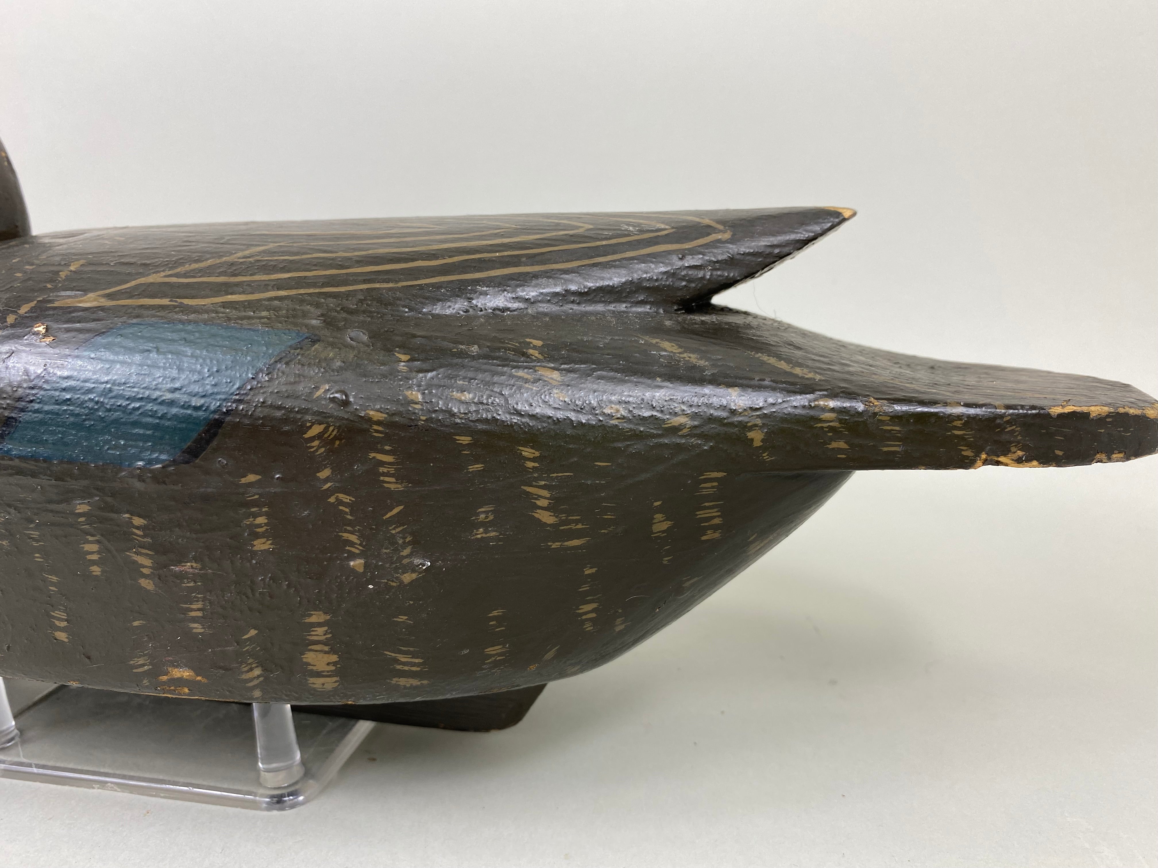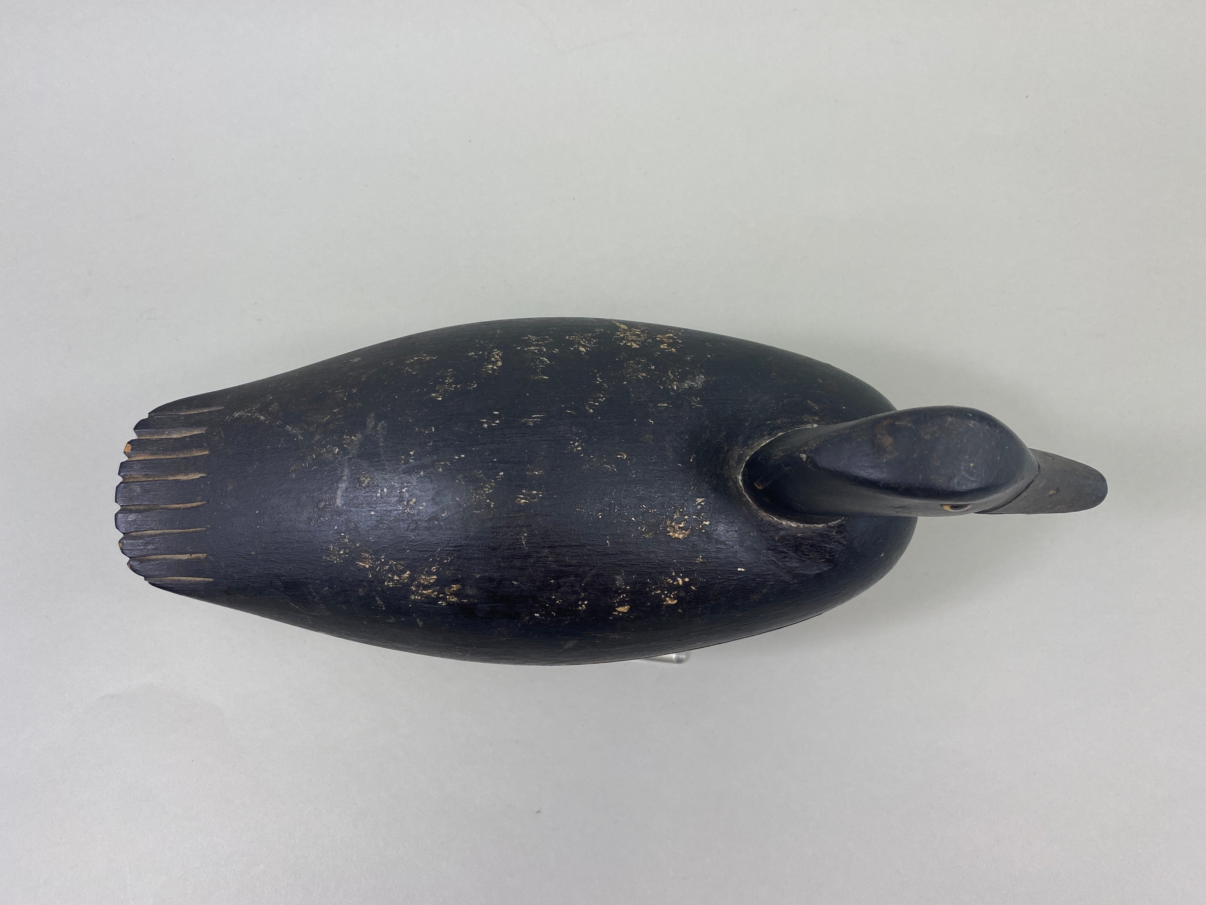 Bill Beardsley Black Duck, New Jersey. Circa 1930's, glass eyes, original paint, hollow body, wooden keel with lead weight and rigging hook. Decoy has split tail, bee-bee marks, and some...