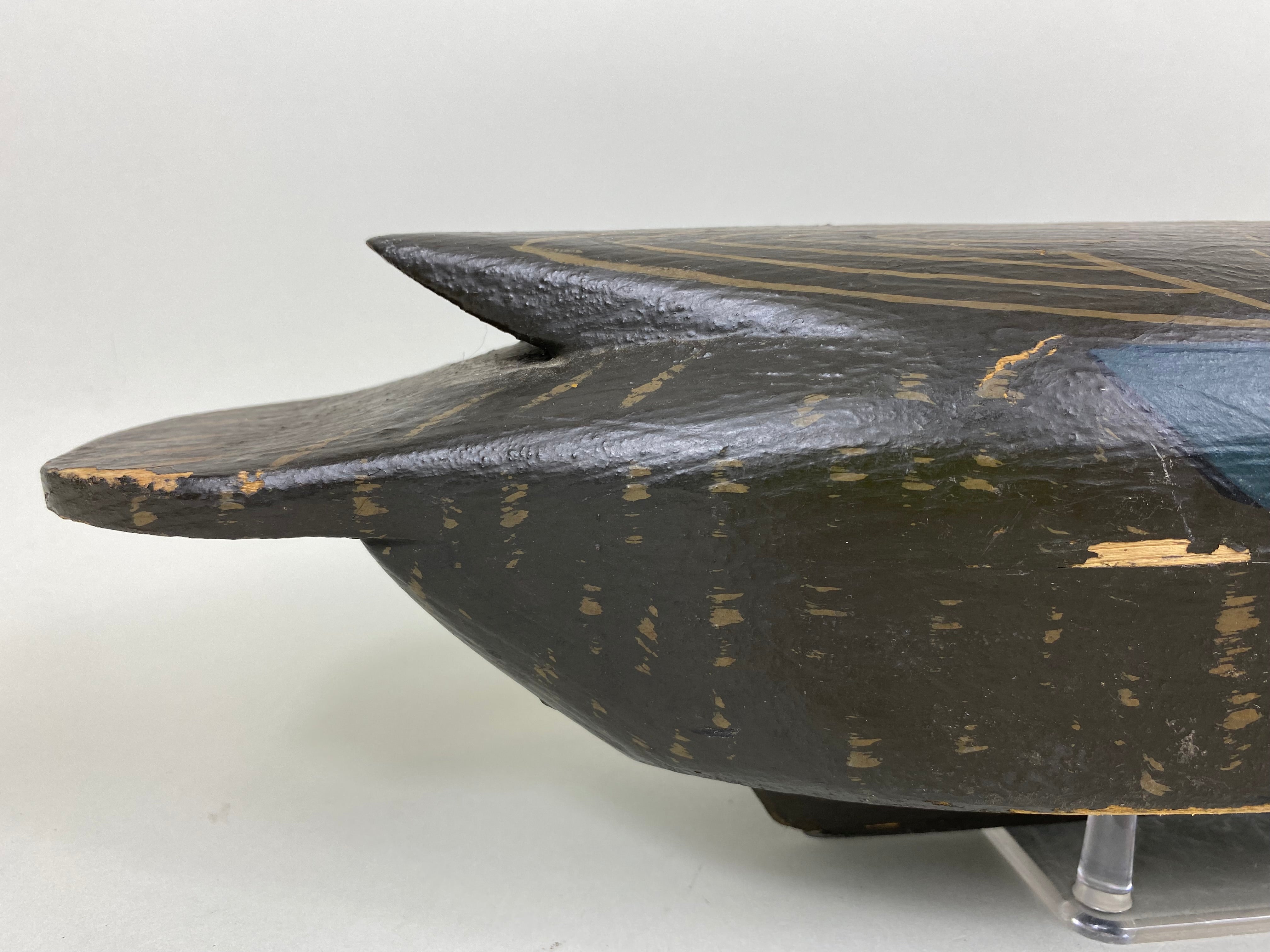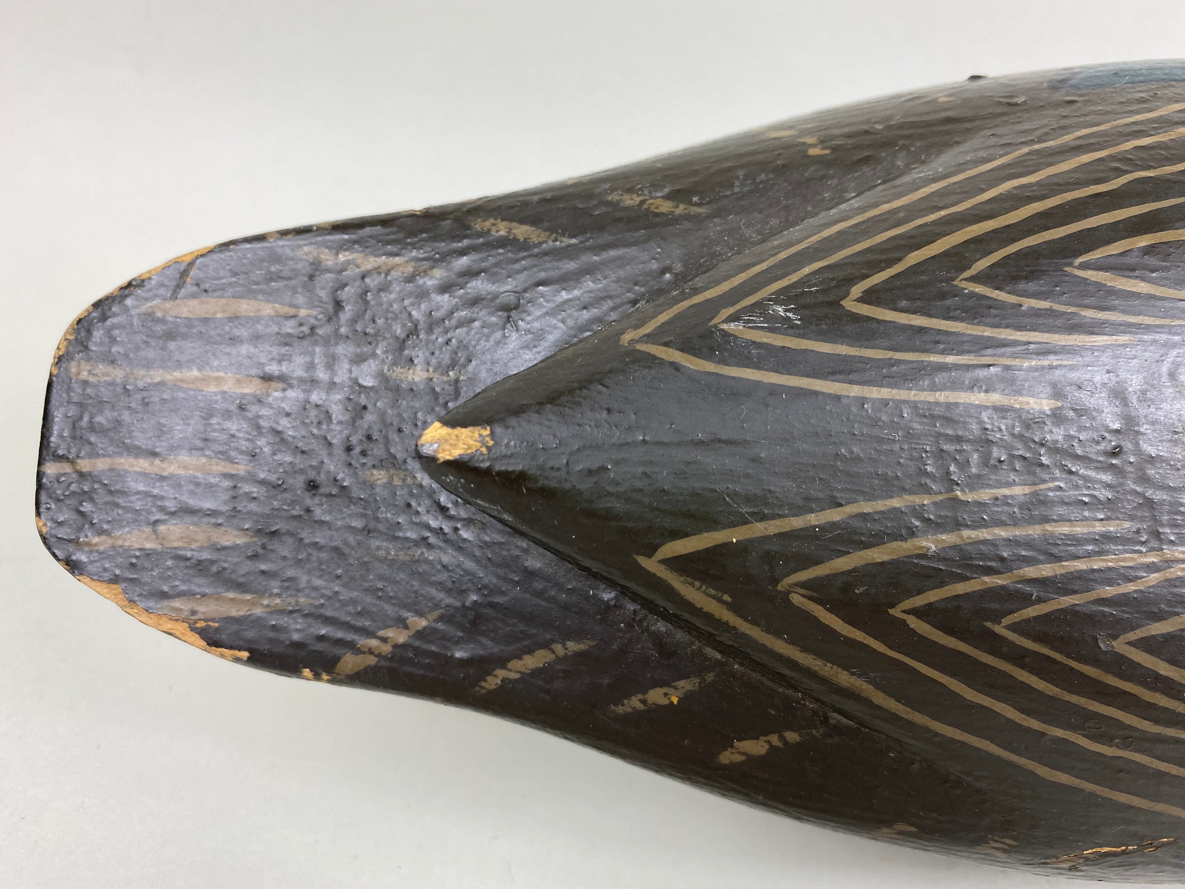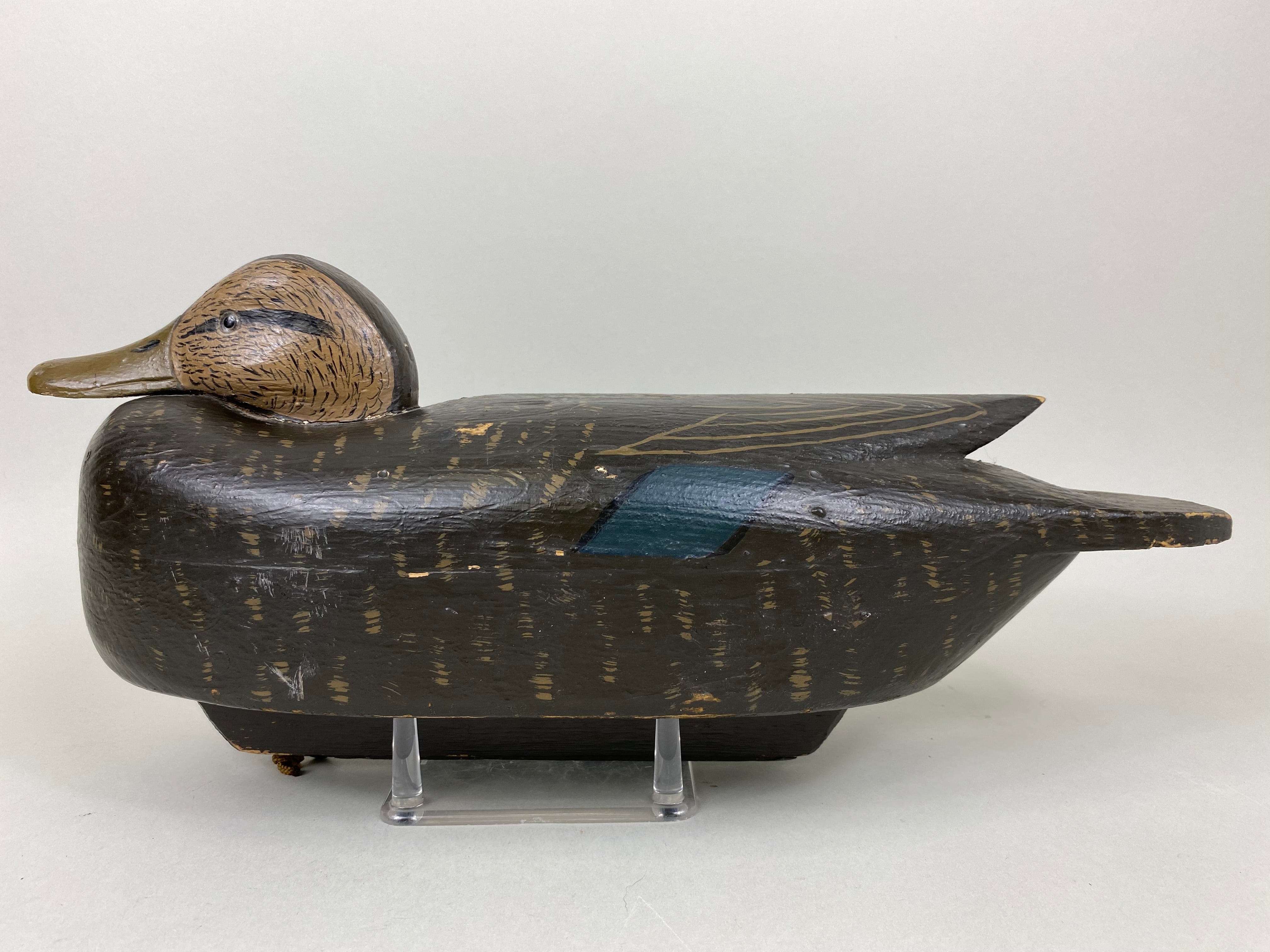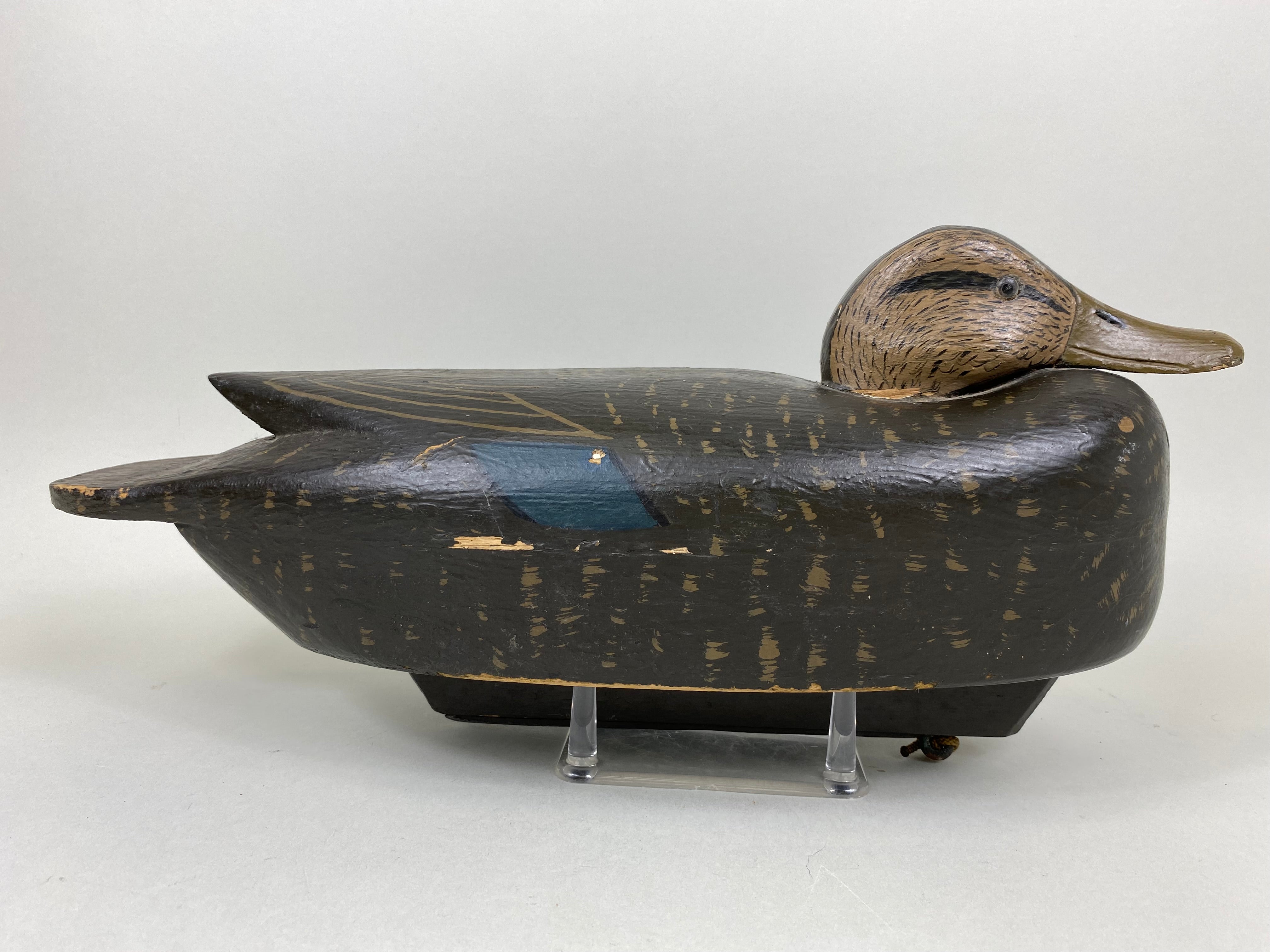Bill Beardsley Black Duck, New Jersey. Circa 1930's, glass eyes, original paint, hollow body, wooden keel with lead weight and rigging hook. Decoy has split tail, bee-bee marks, and some...