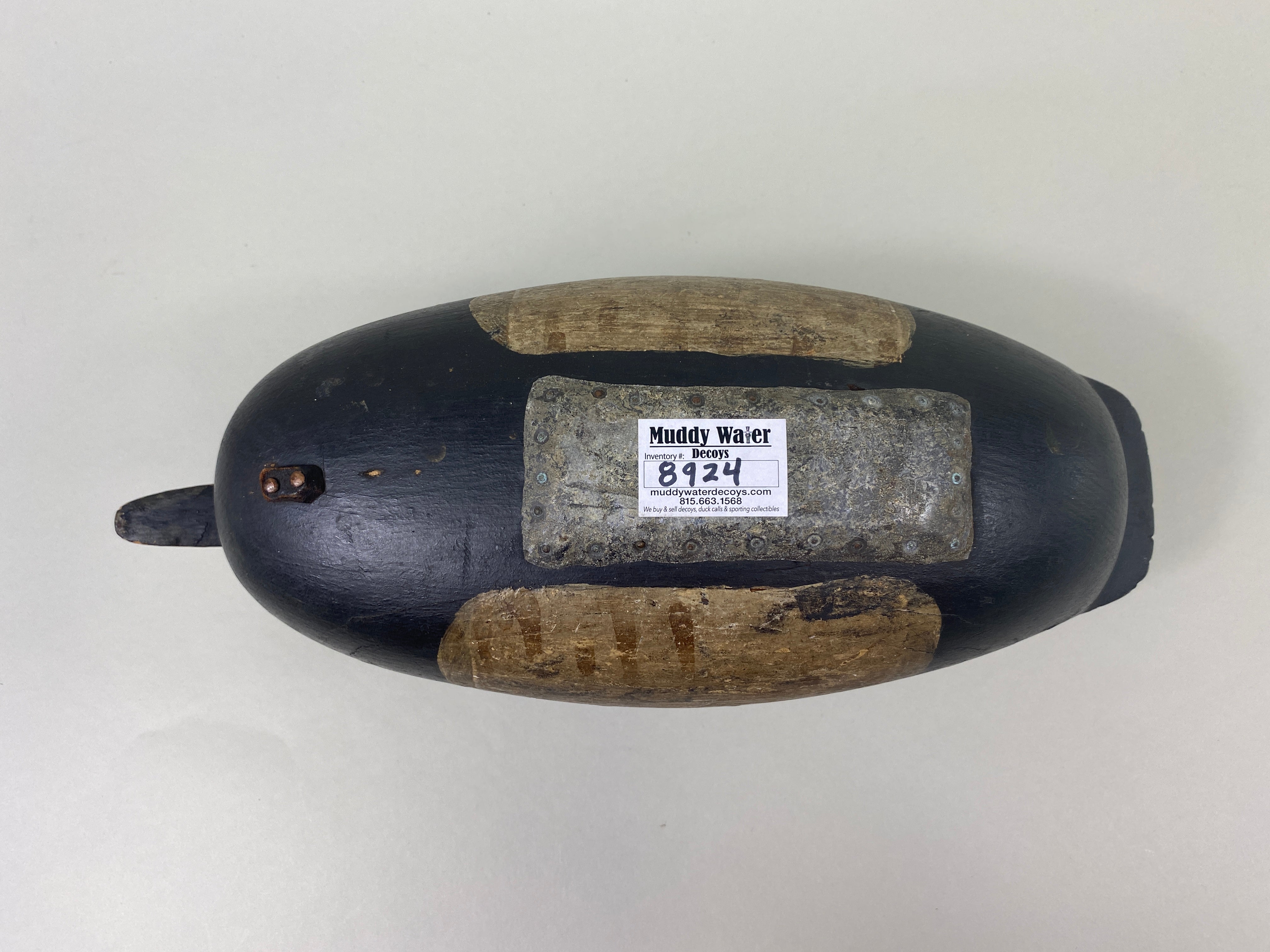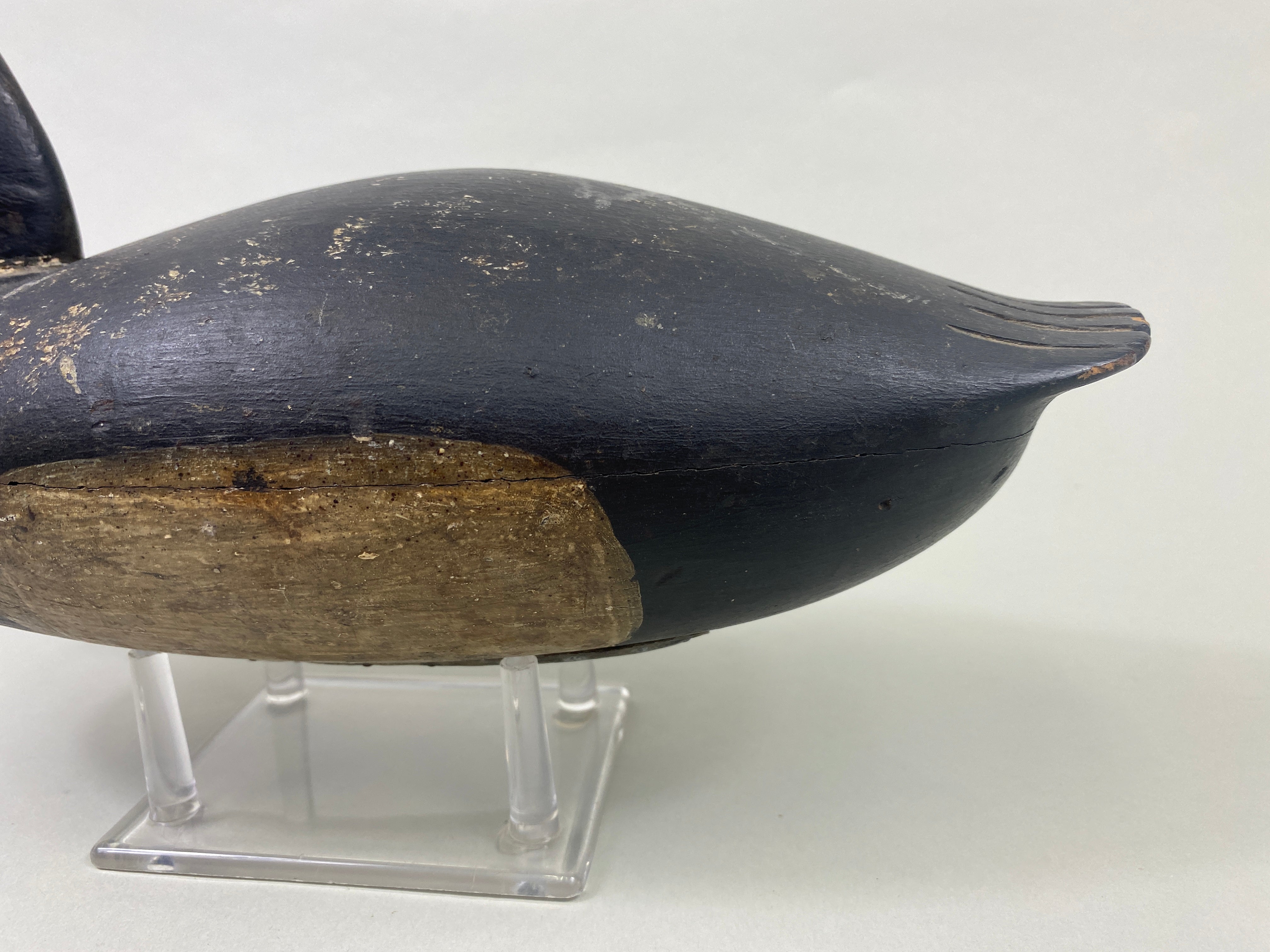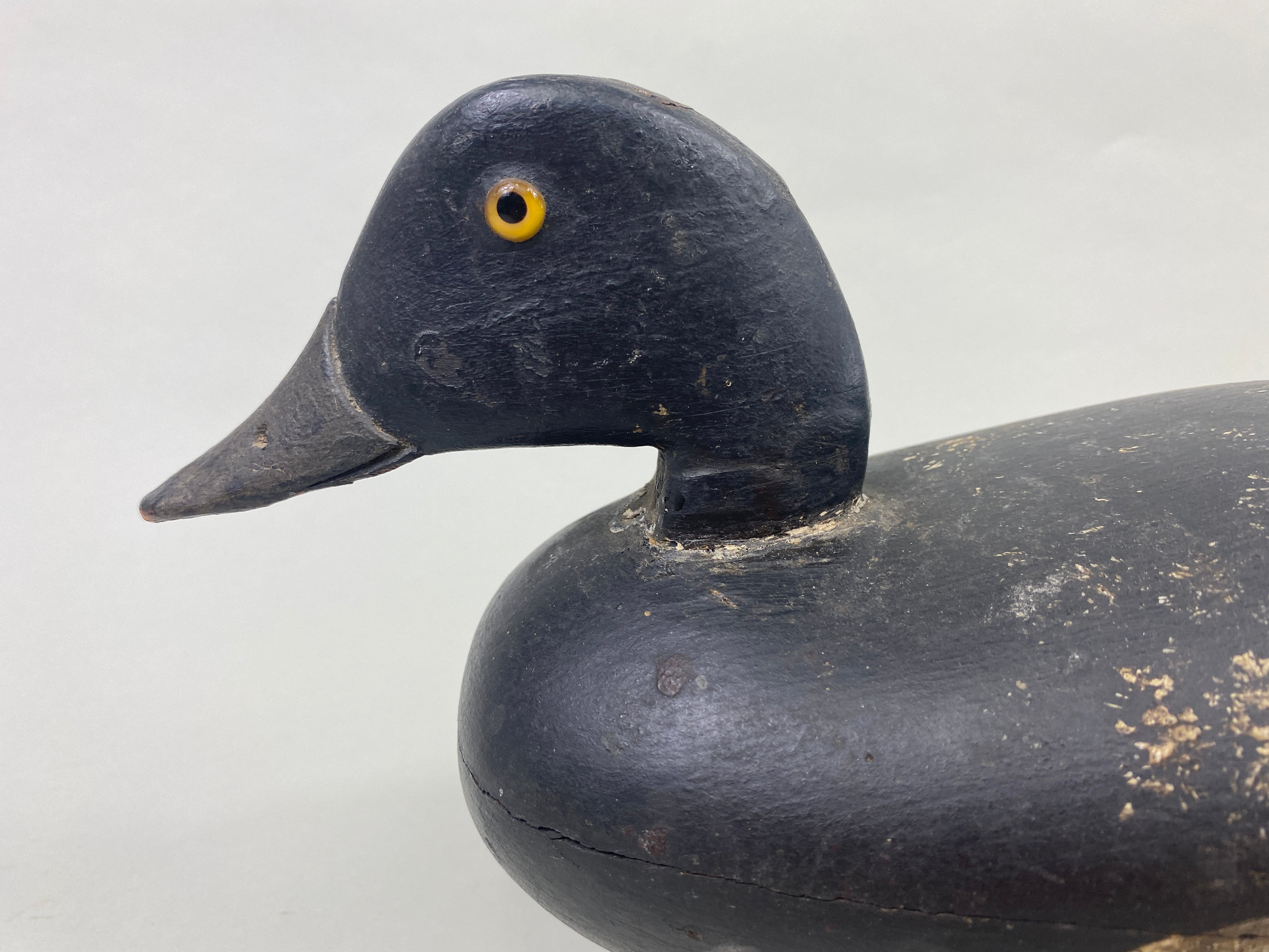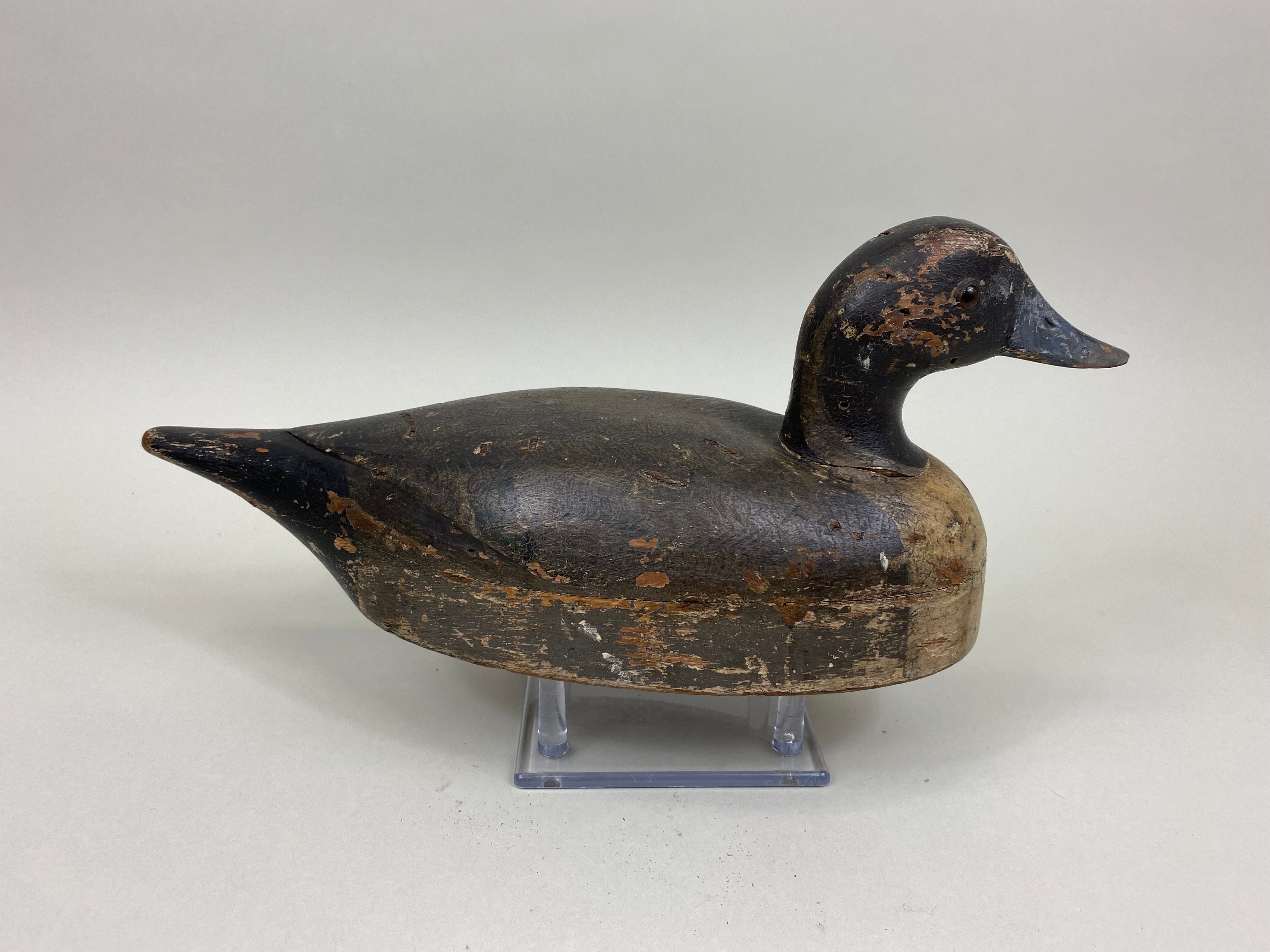 English Family Delaware River Bluebill Drake. Circa 1920's, hollow, old hunter repaint, glass eyes, carved tail, lead weight and piece of leather rigging strap on bottom, carved tail, hunting wear,...