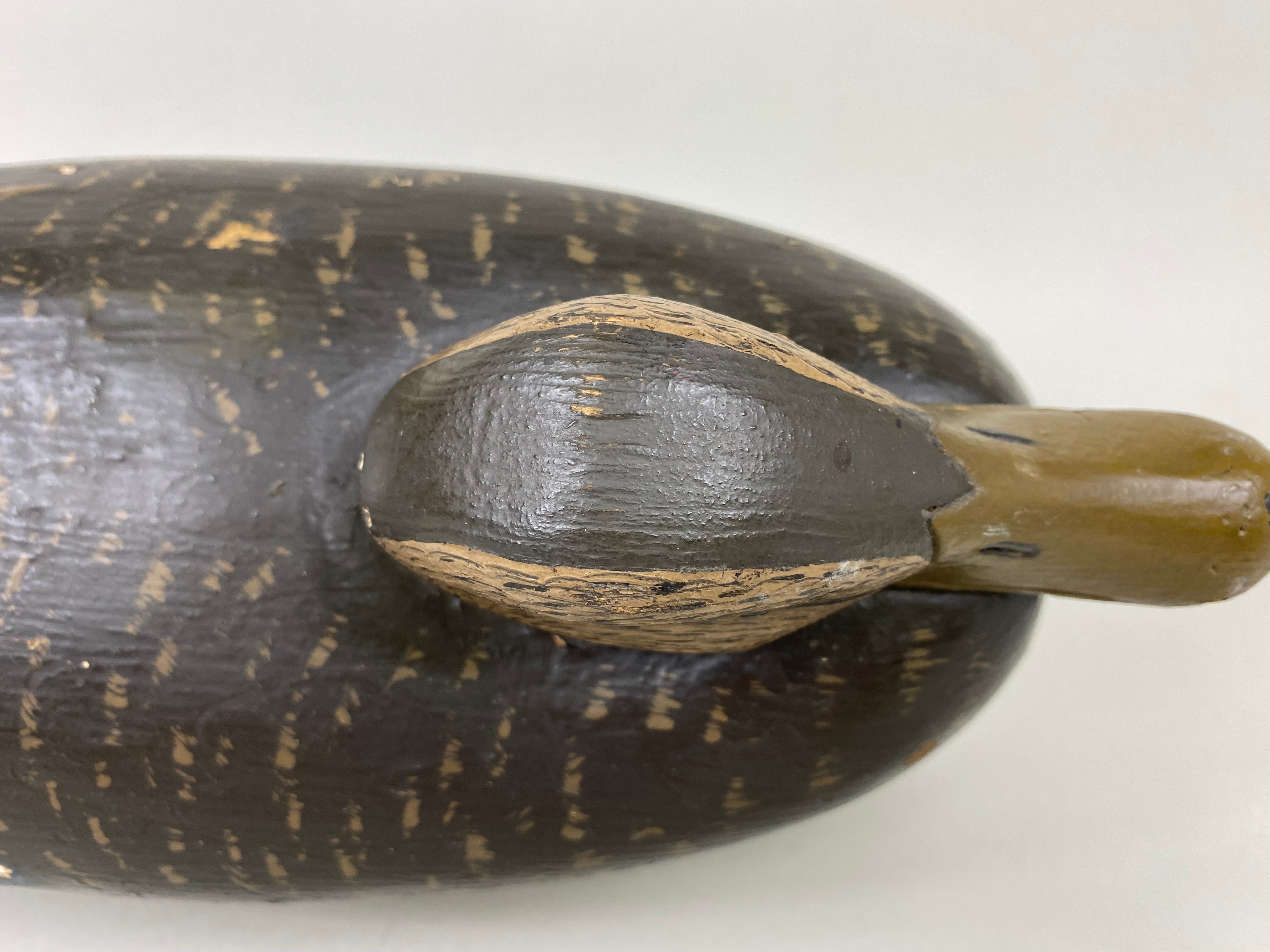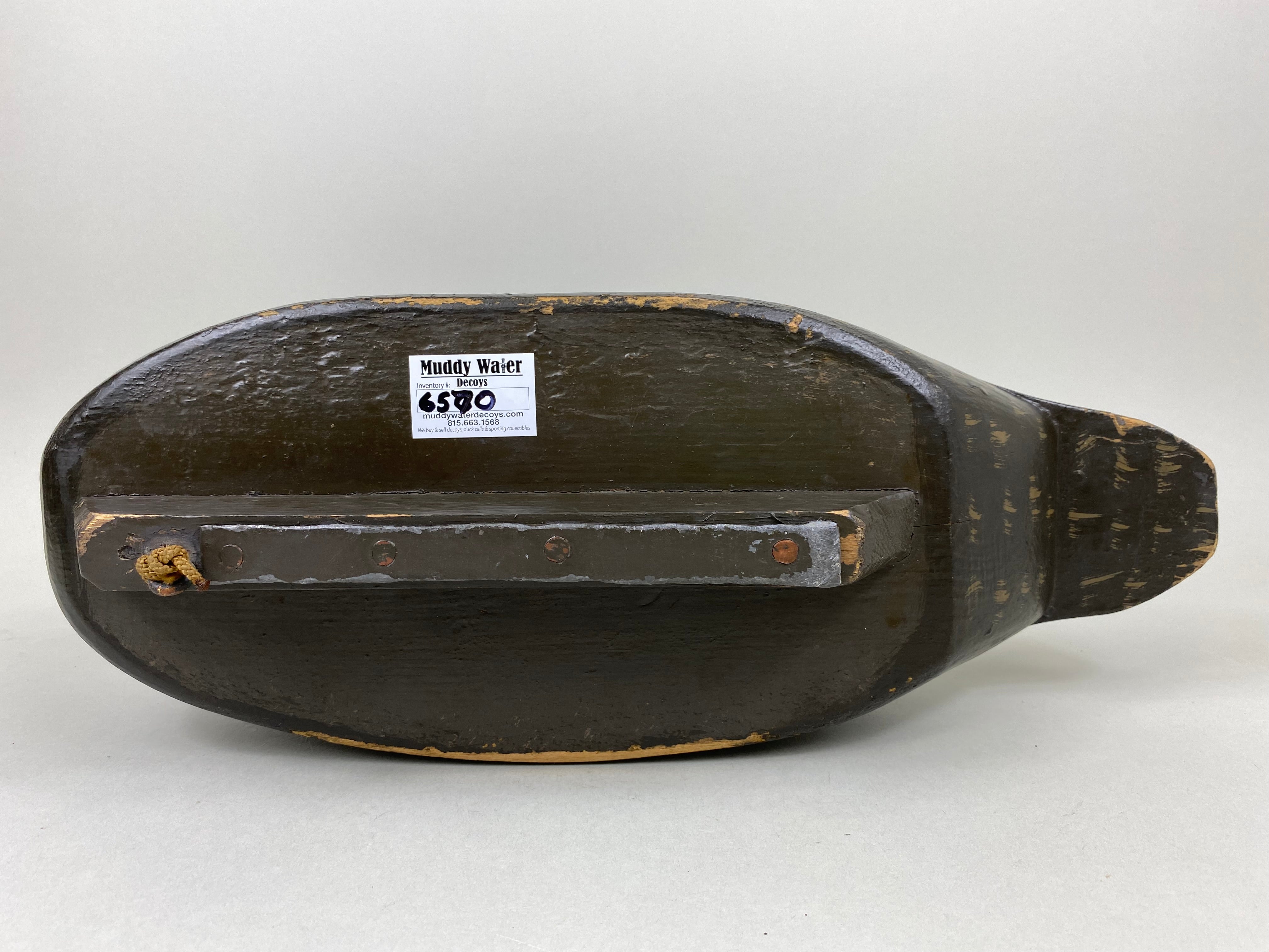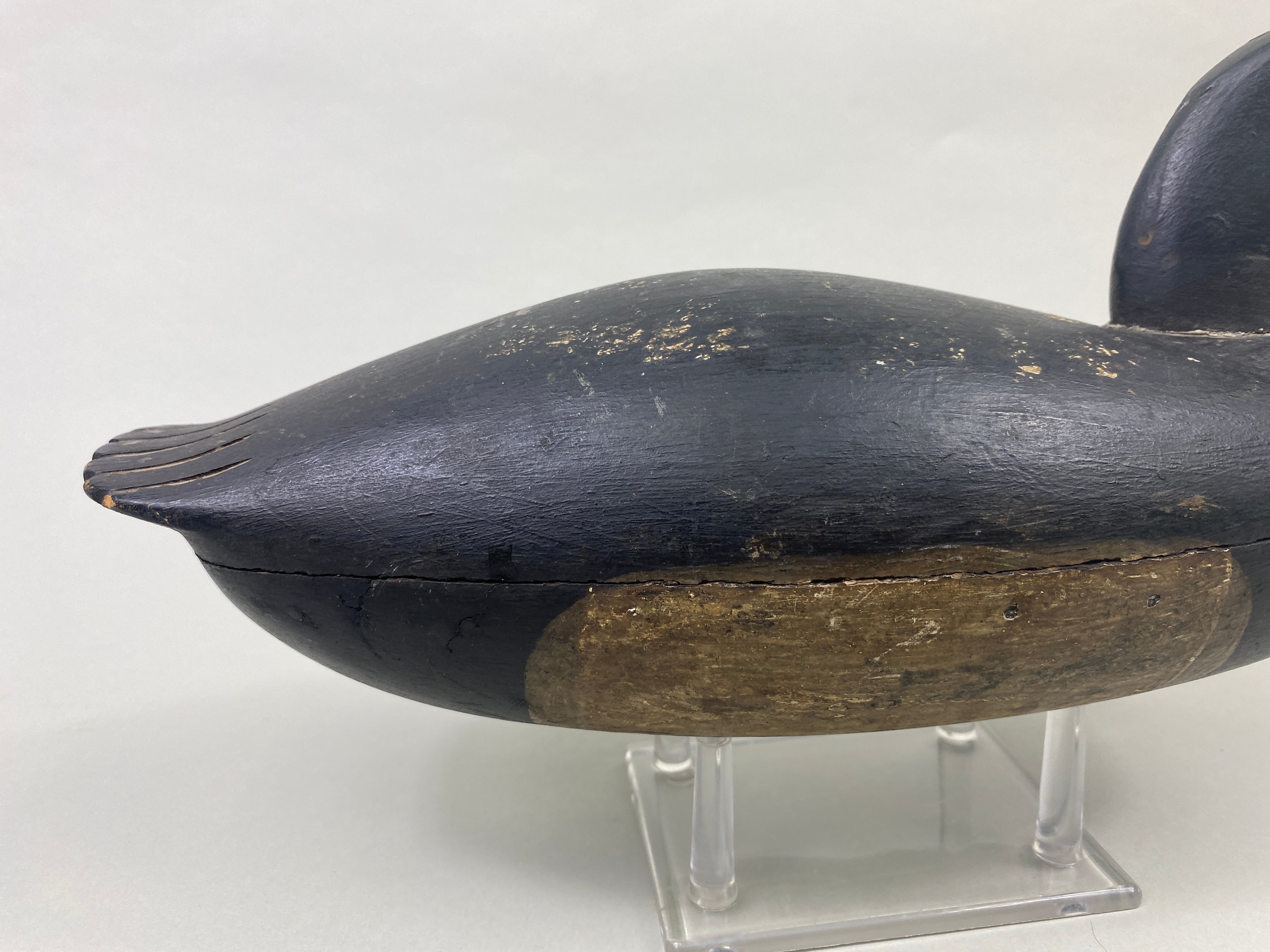 English Family Delaware River Bluebill Drake. Circa 1920's, hollow, old hunter repaint, glass eyes, carved tail, lead weight and piece of leather rigging strap on bottom, carved tail, hunting wear,...