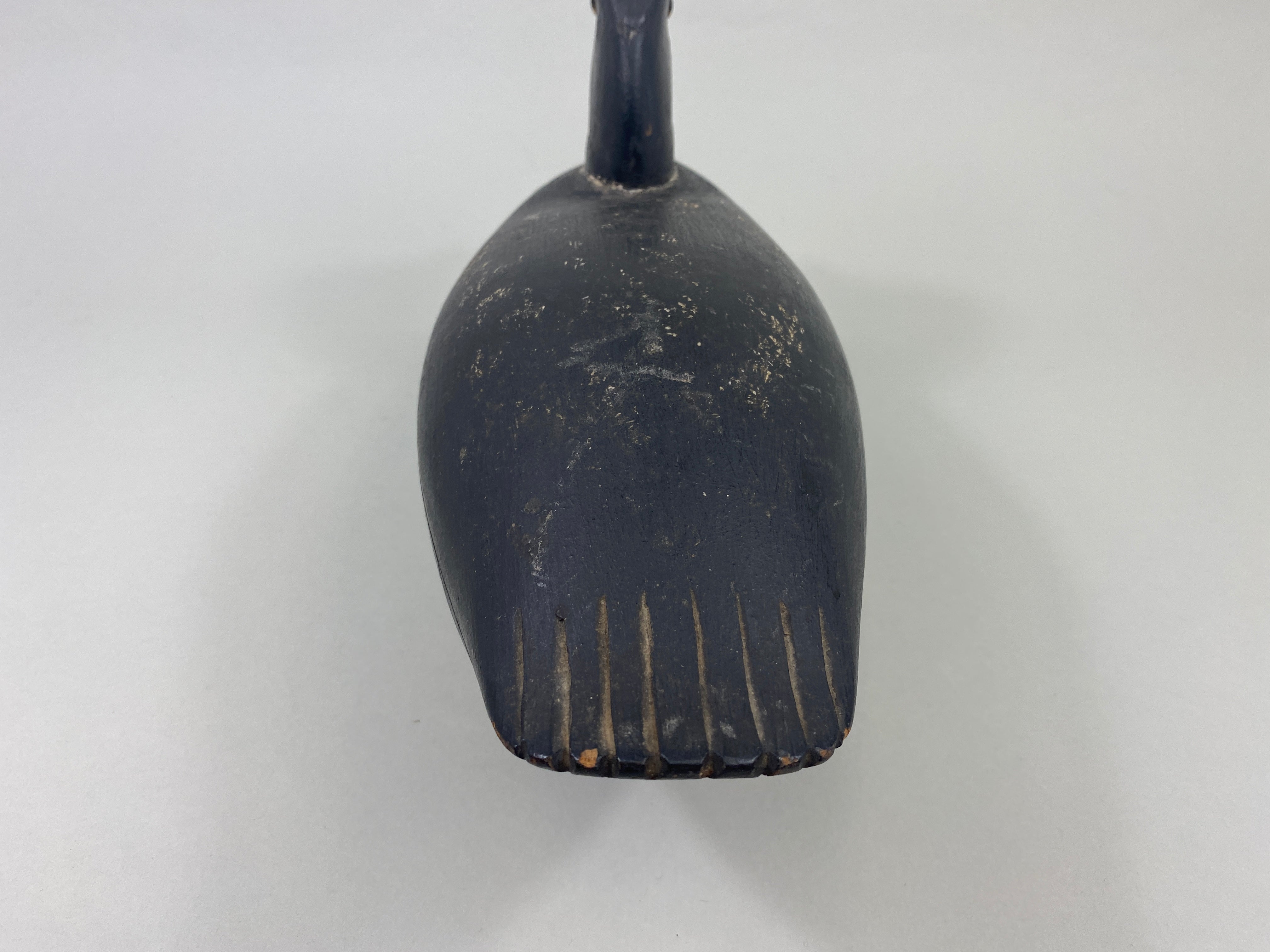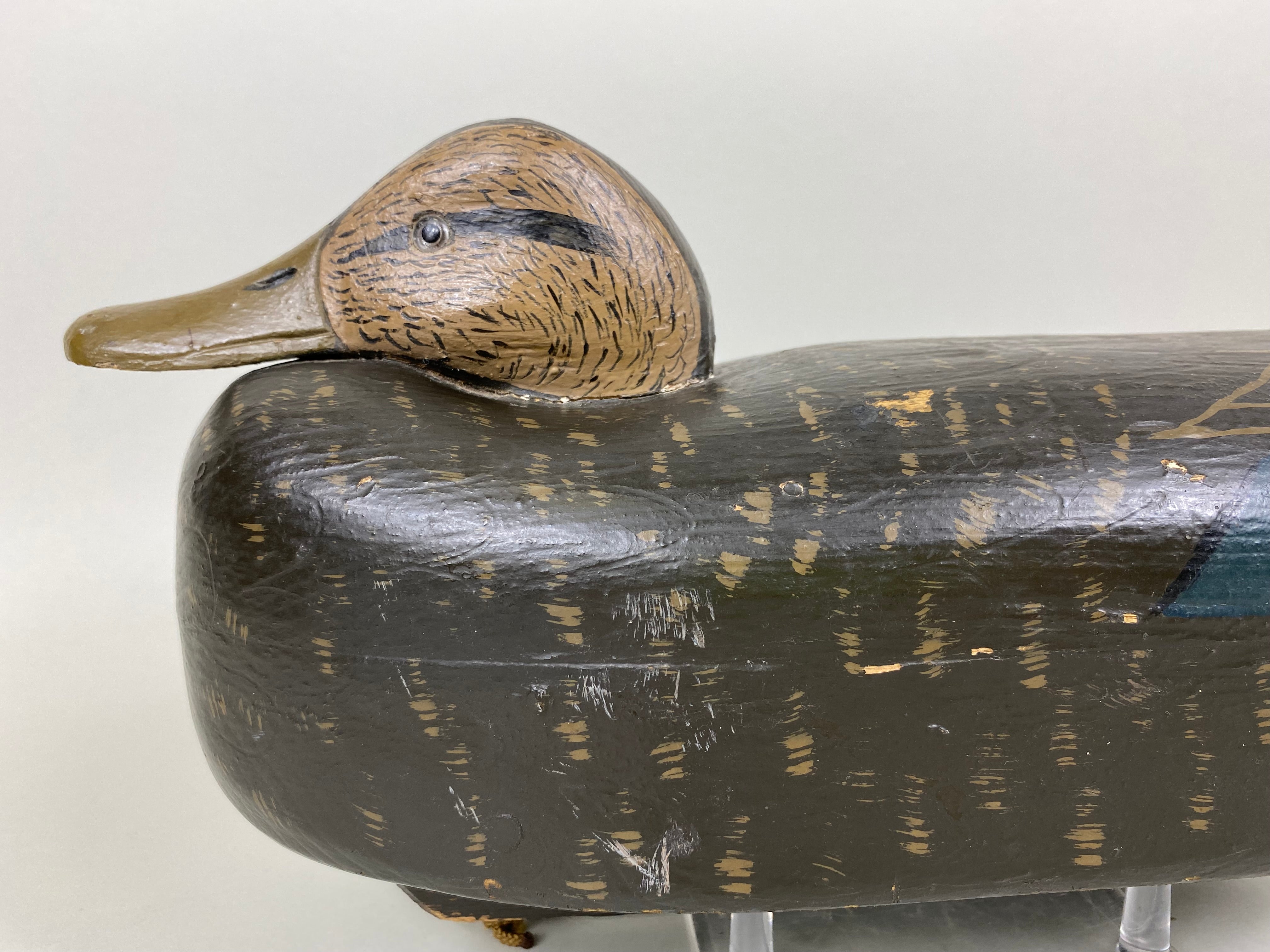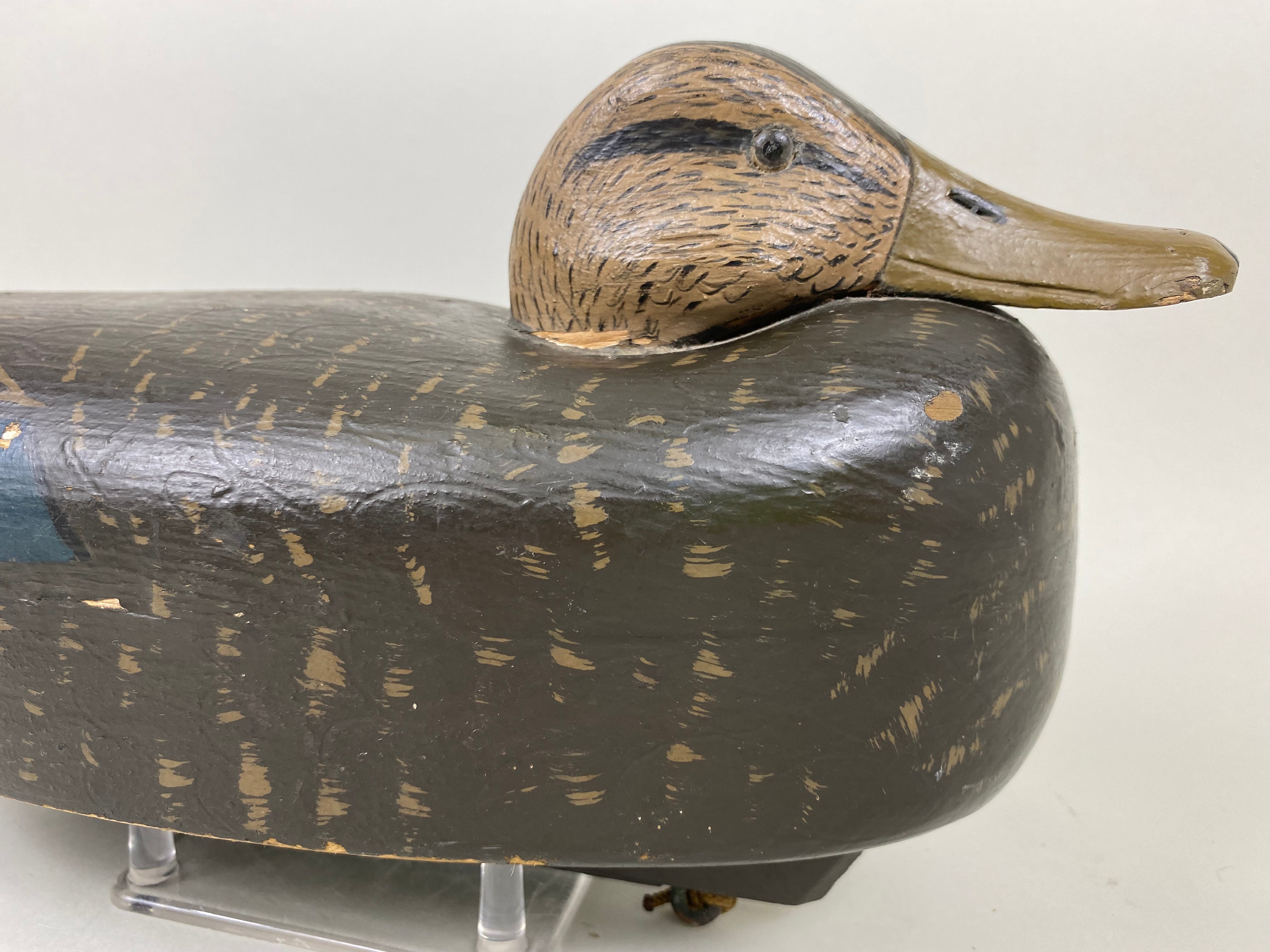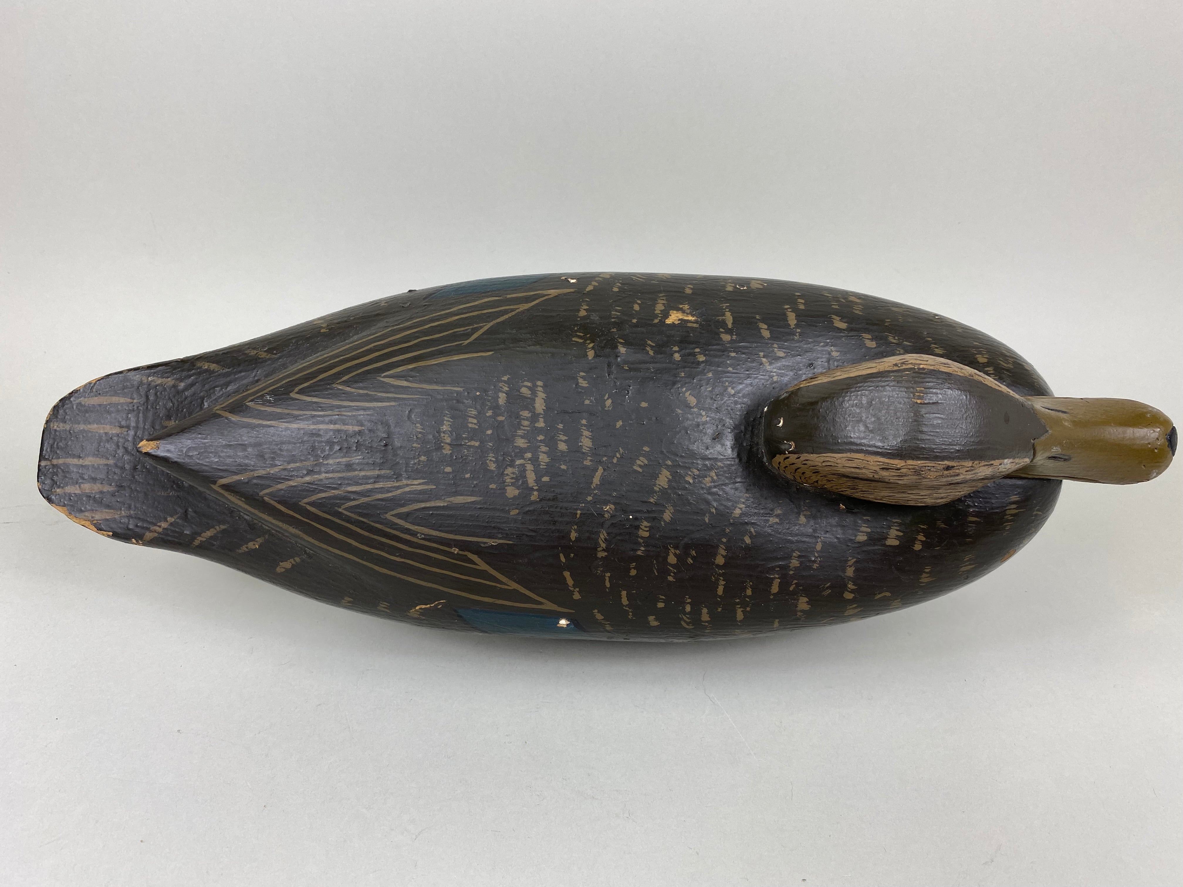 English Family Delaware River Bluebill Drake. Circa 1920's, hollow, old hunter repaint, glass eyes, carved tail, lead weight and piece of leather rigging strap on bottom, carved tail, hunting wear,...