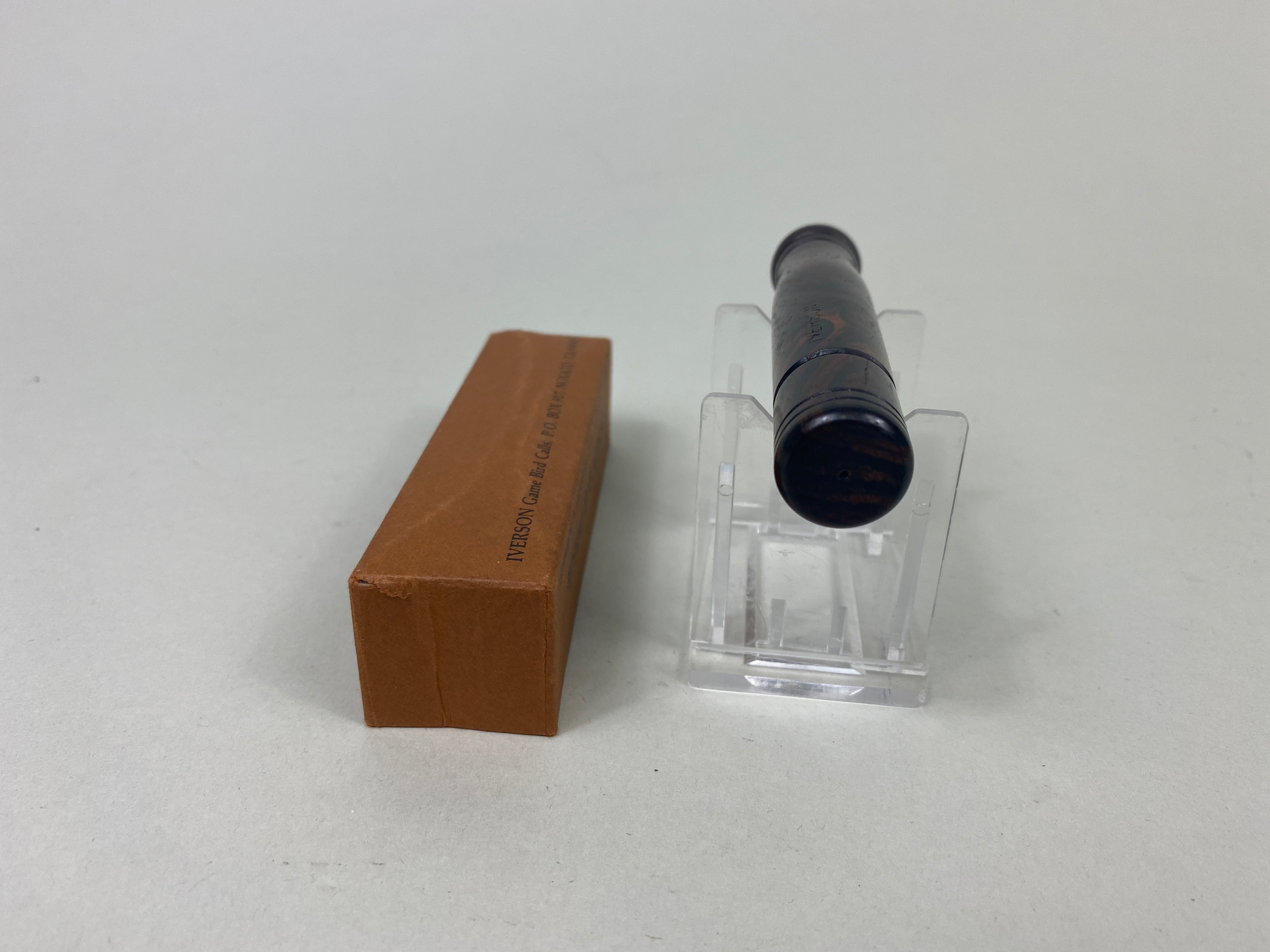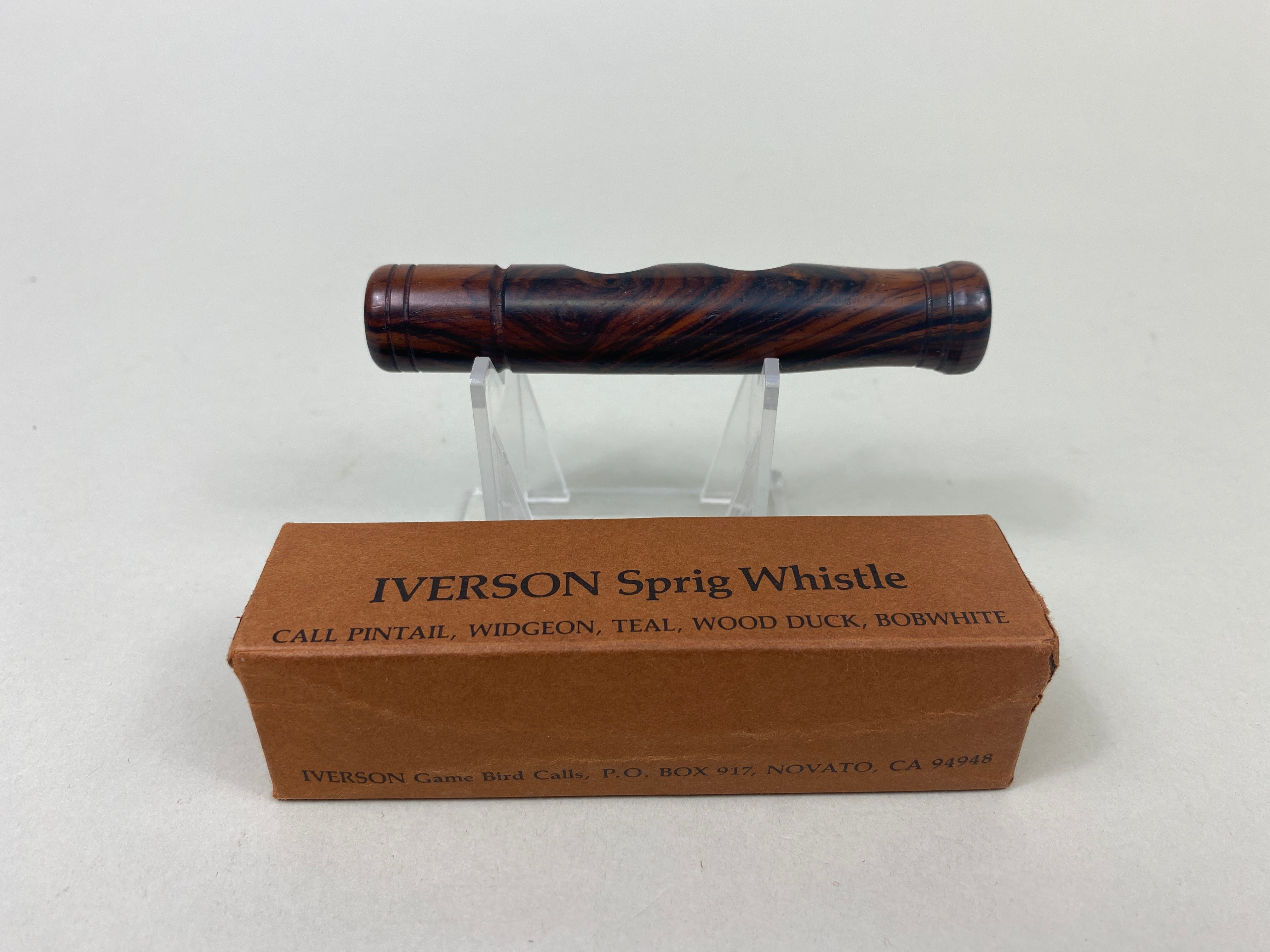 Iverson Sprig Whistle in Original Box with original paperwork, Novato, California. Call is in very good condition and works, measures 4" long, box has minor wear.