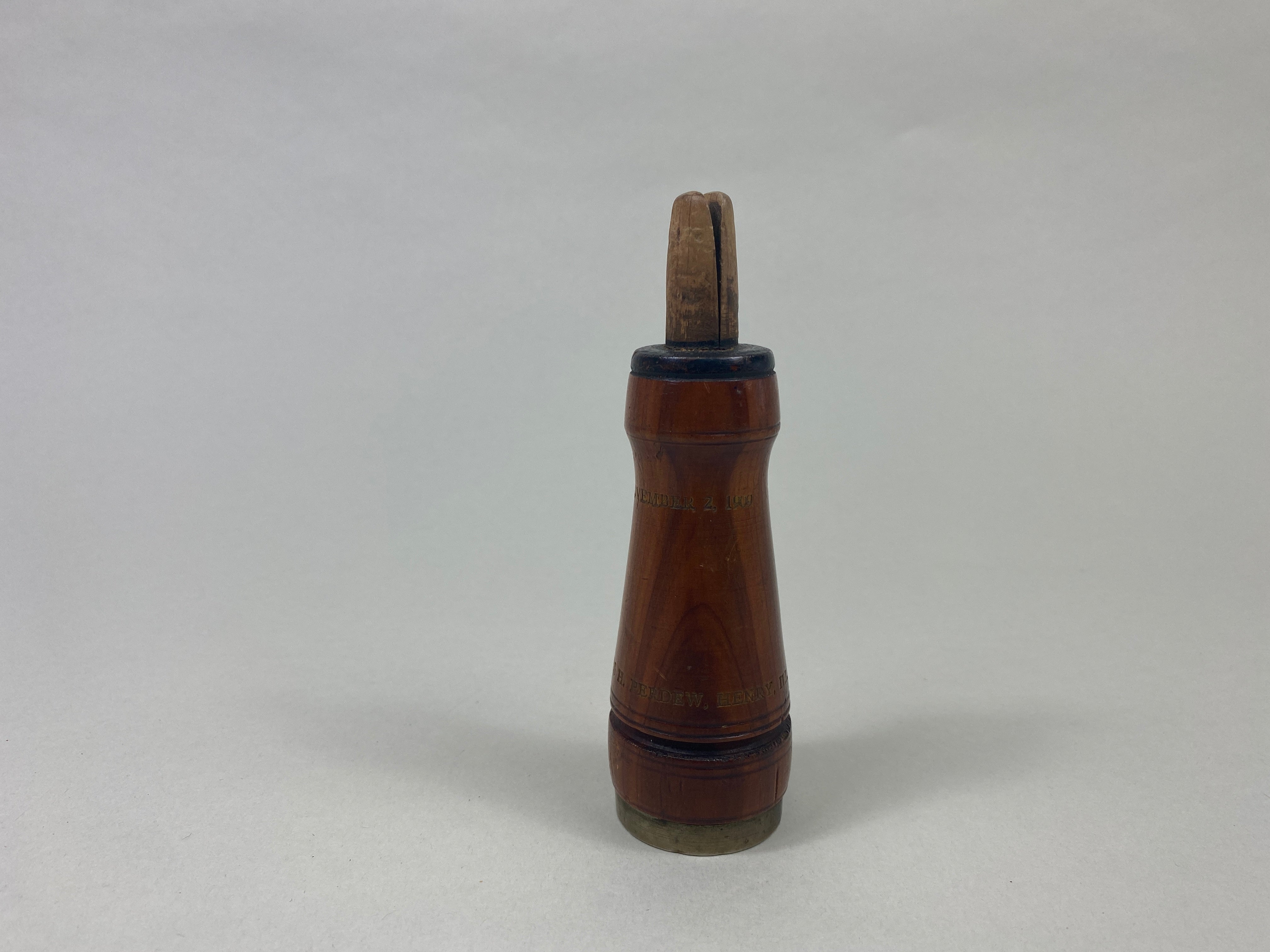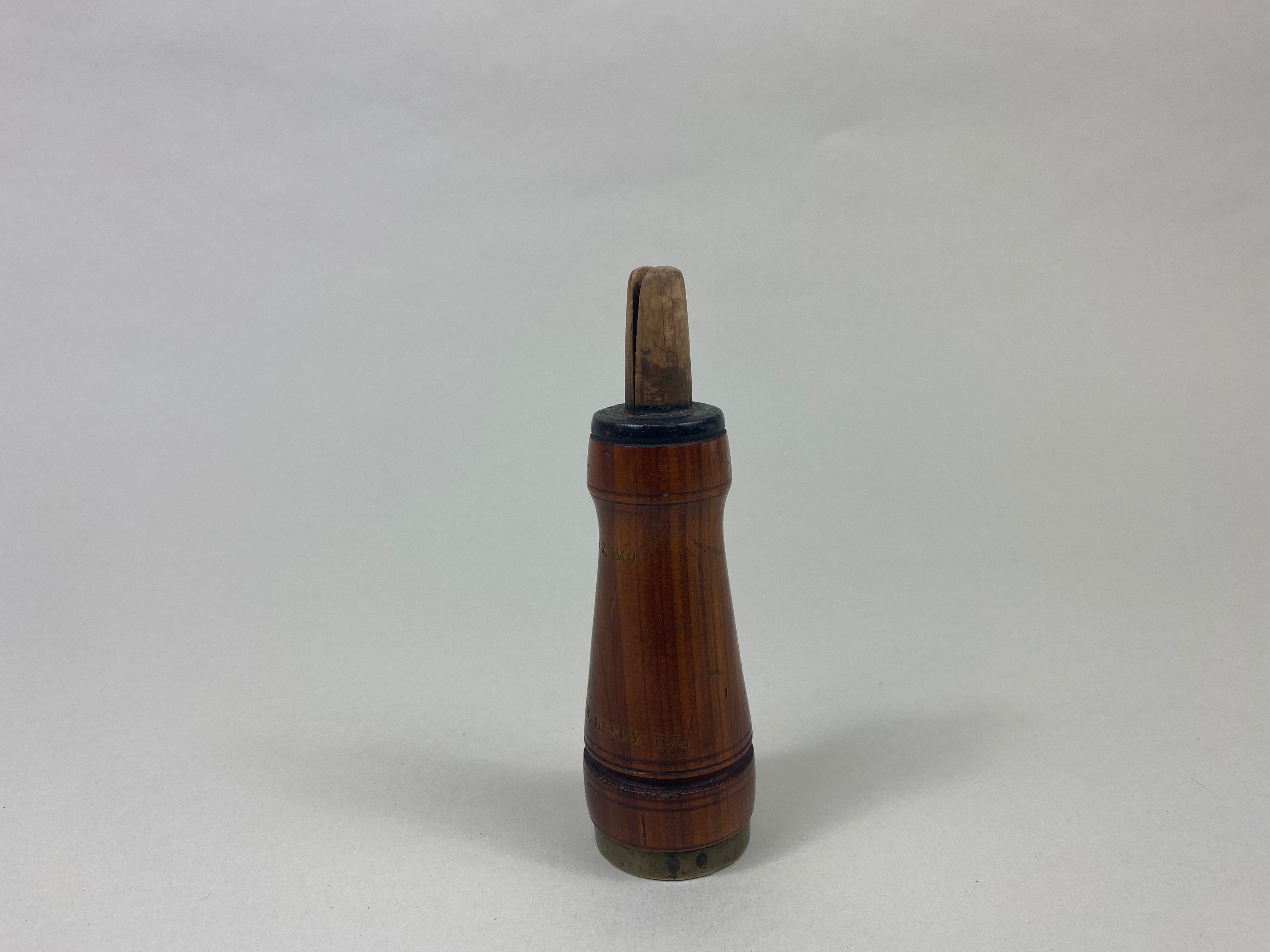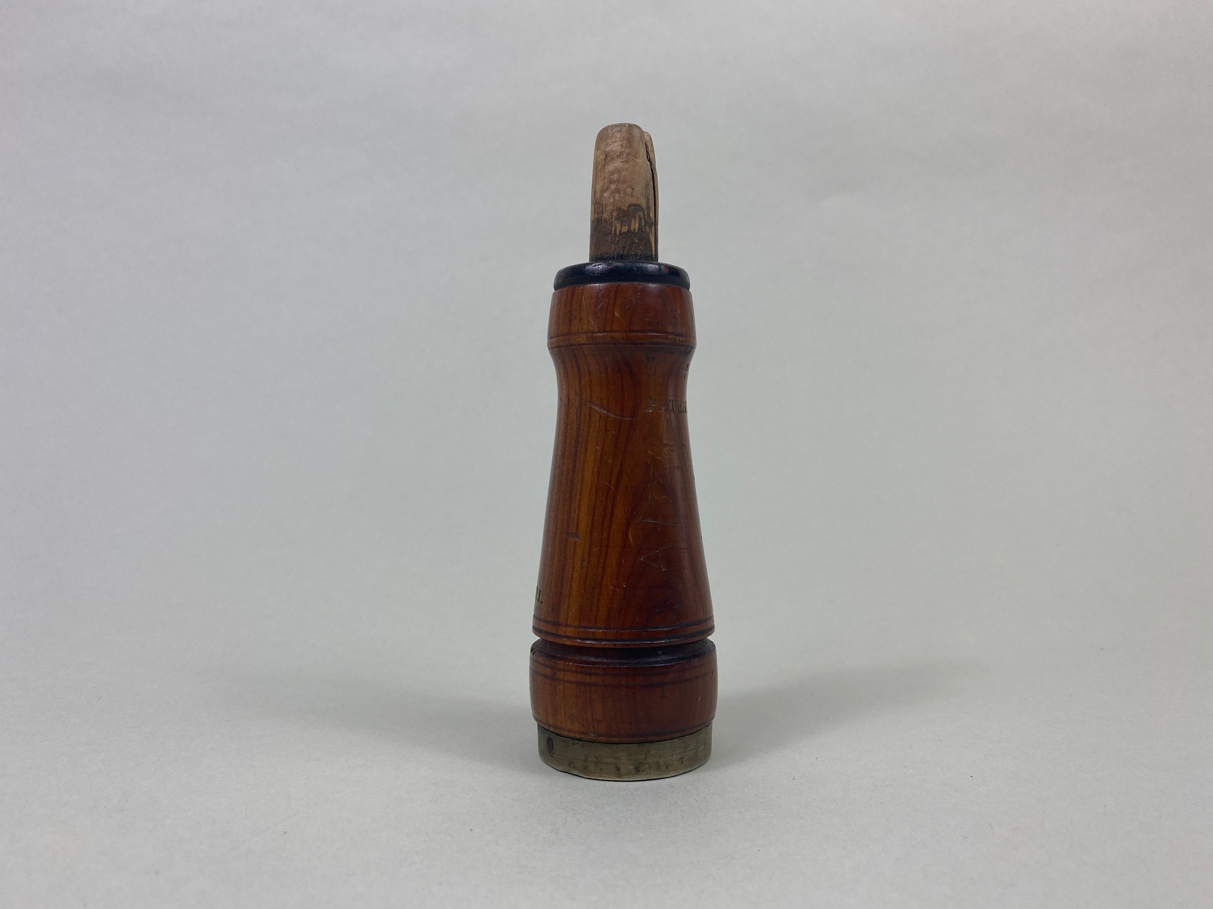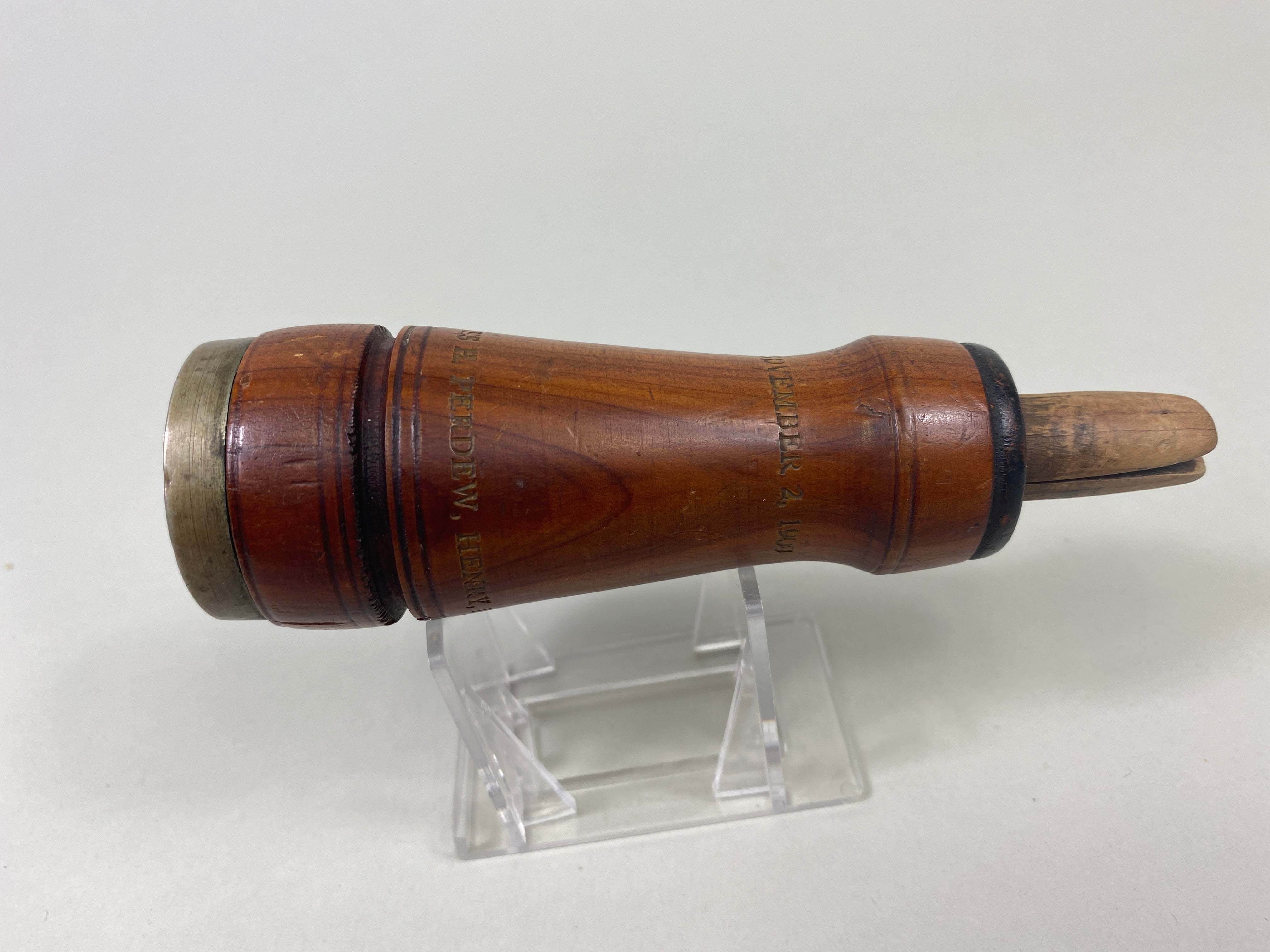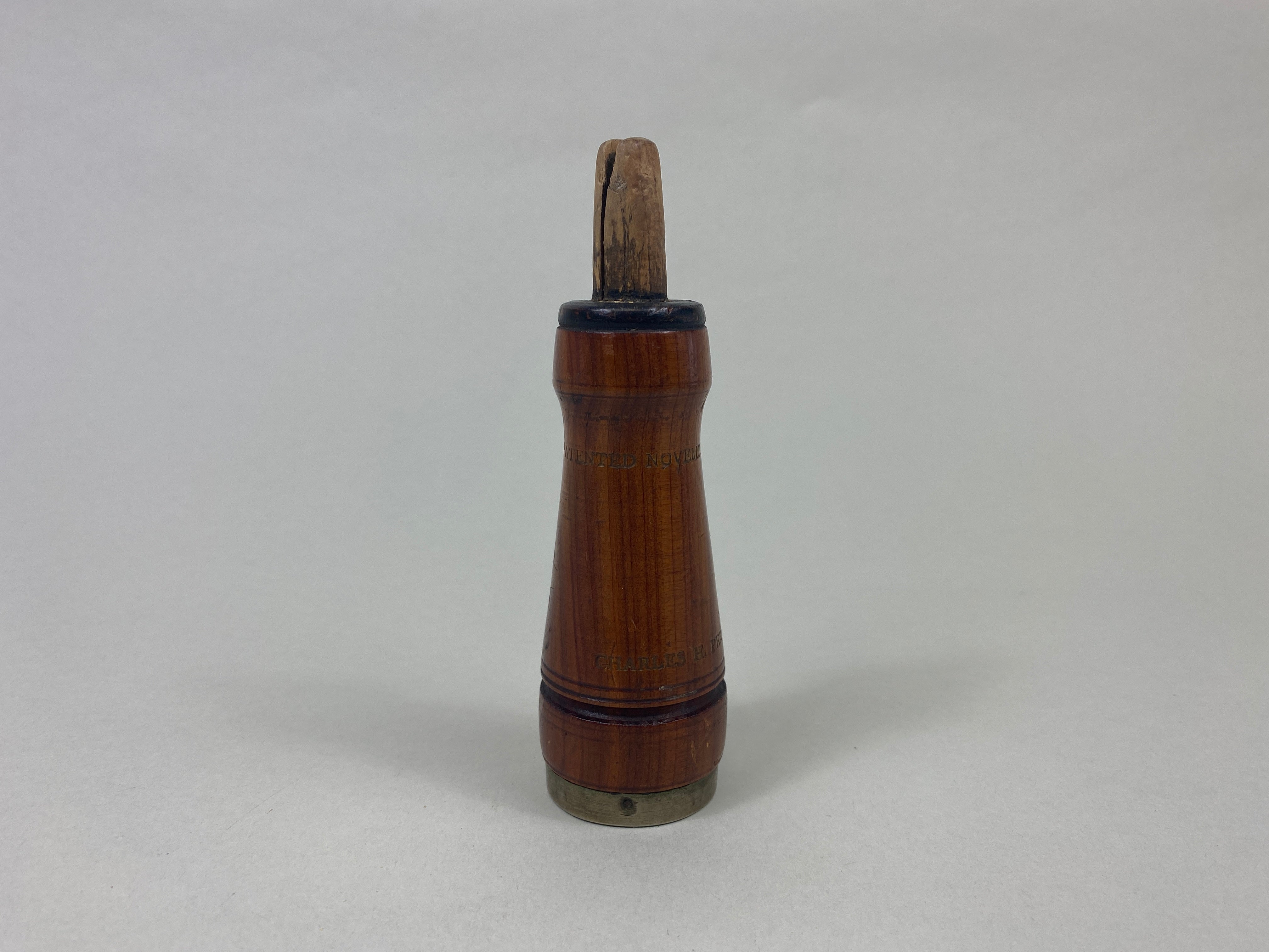 Charles Perdew Crow Call, Henry Illinois. "PATENTED NOVEMBER 2, 1909" and "CHARLES. H. PERDEW, HENRY, ILL." on barrel. Call works, has wear from use, and measures approximately 5-1/2".