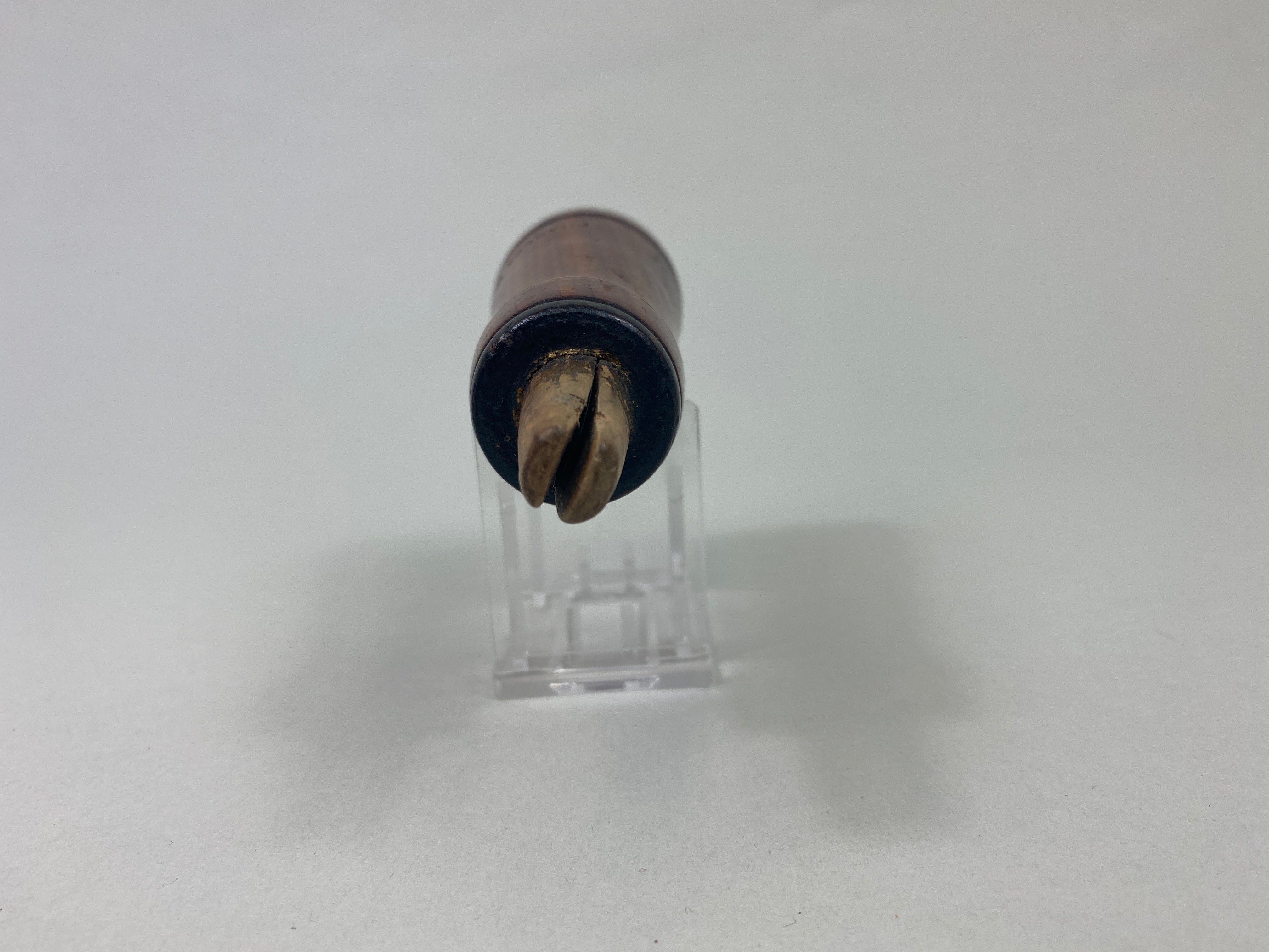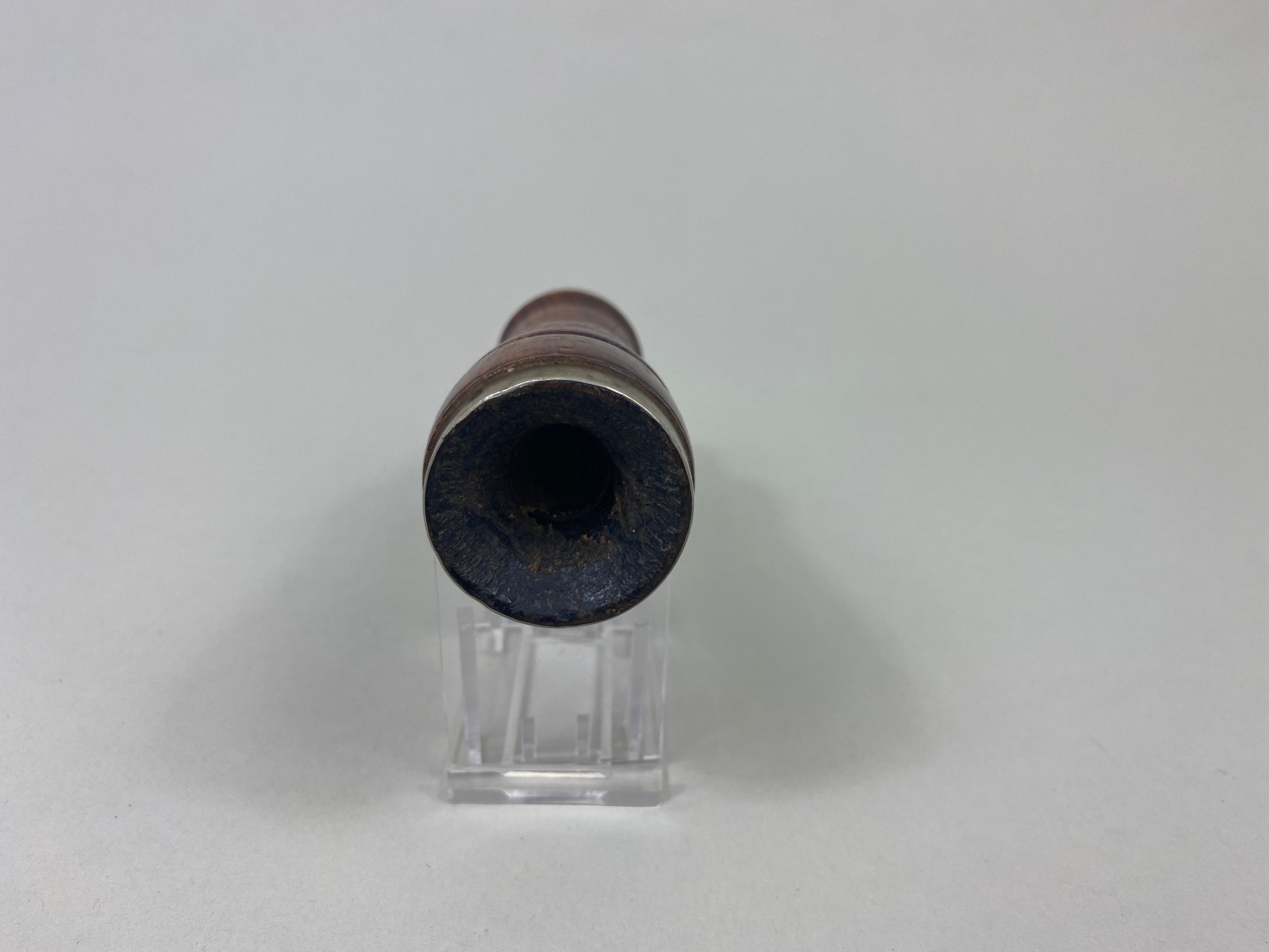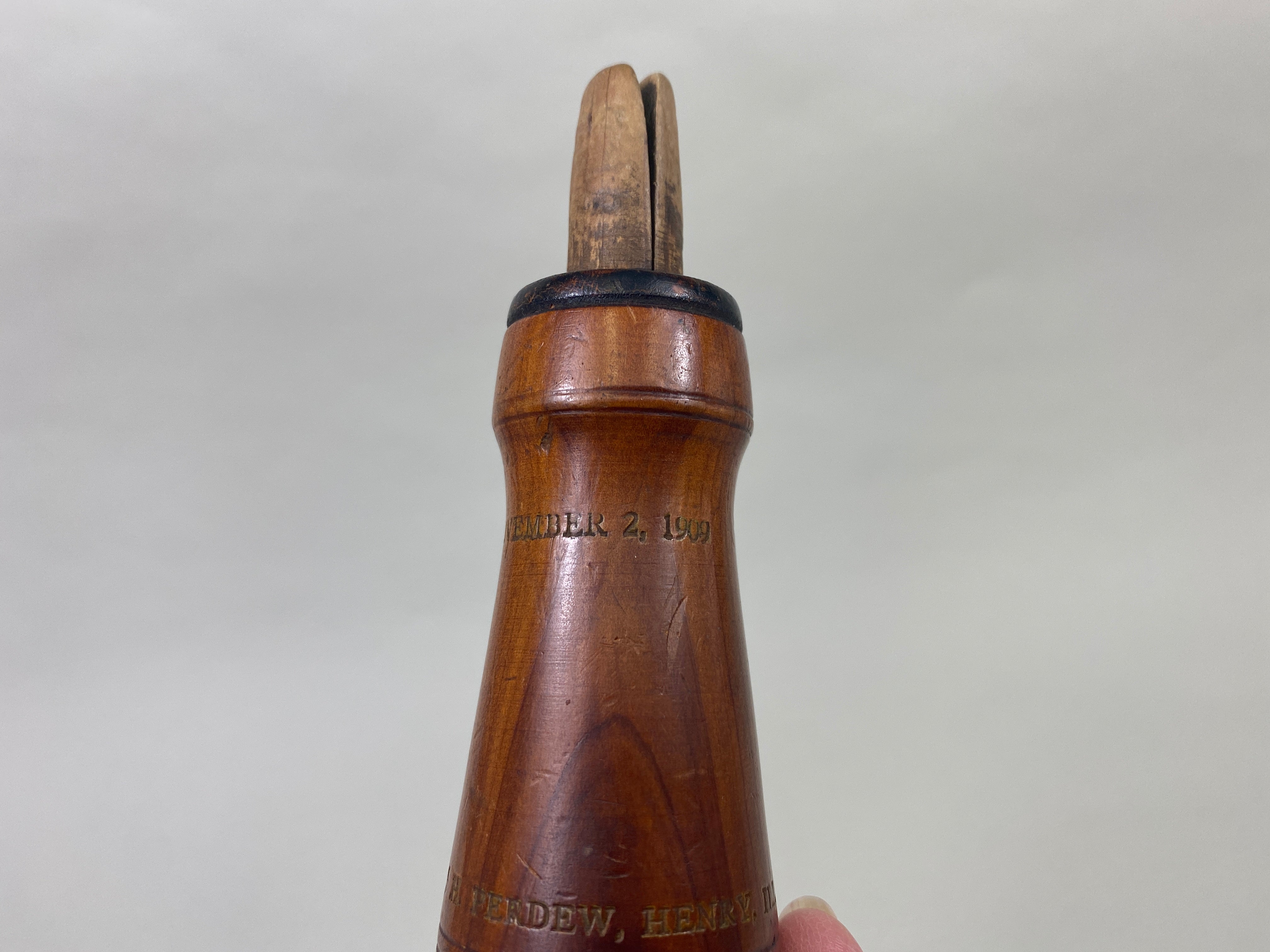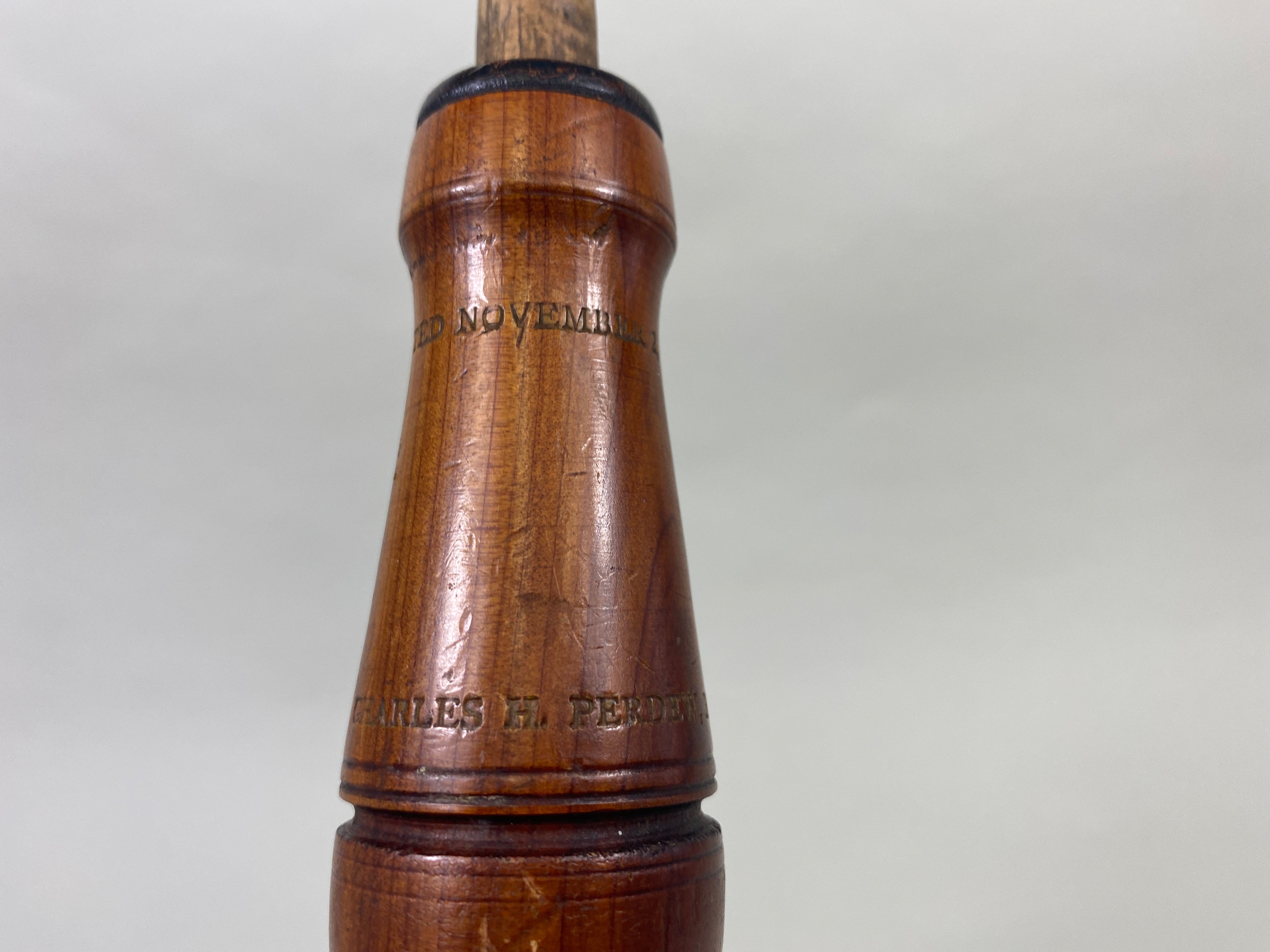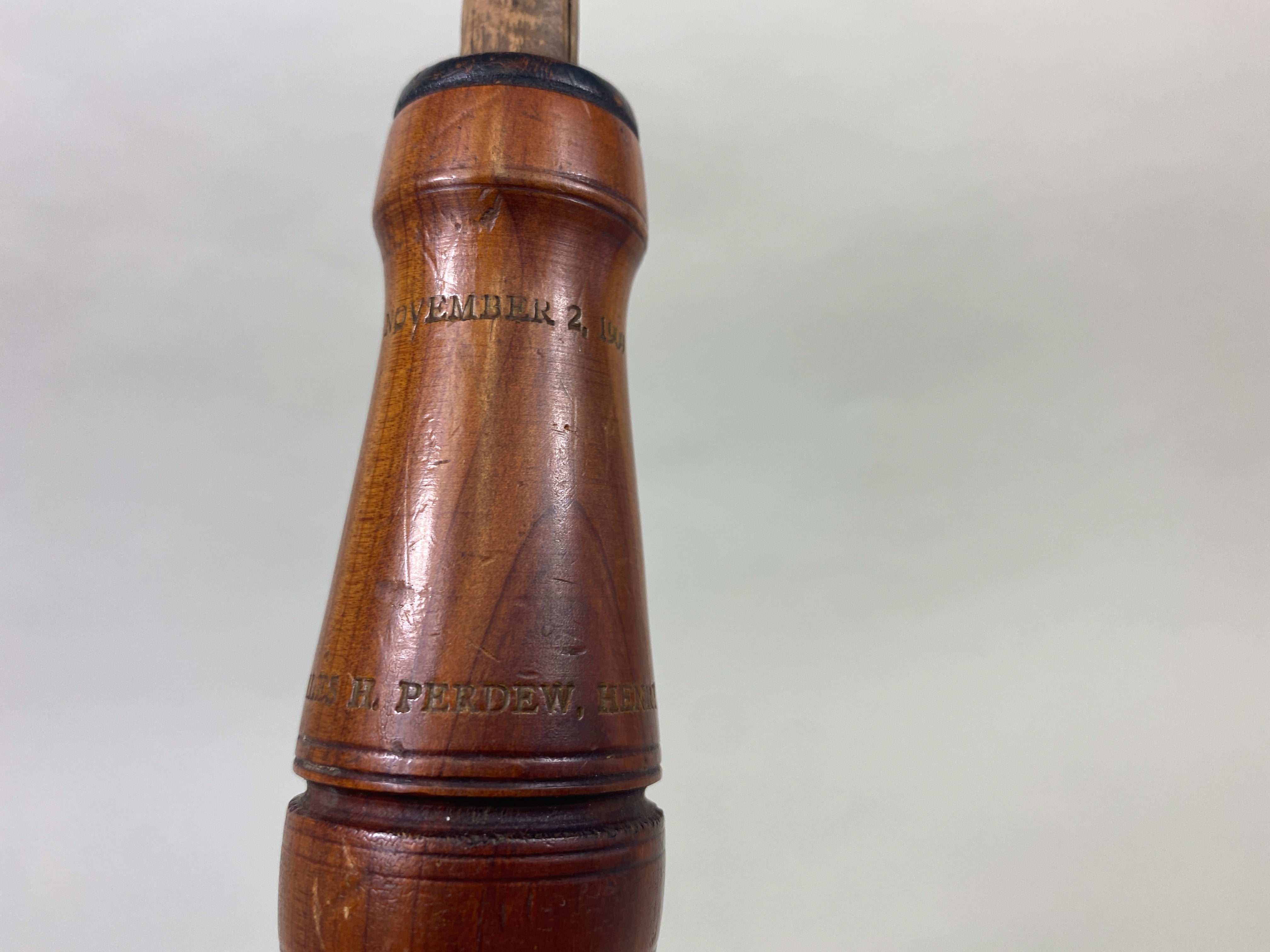 Charles Perdew Crow Call, Henry Illinois. "PATENTED NOVEMBER 2, 1909" and "CHARLES. H. PERDEW, HENRY, ILL." on barrel. Call works, has wear from use, and measures approximately 5-1/2".