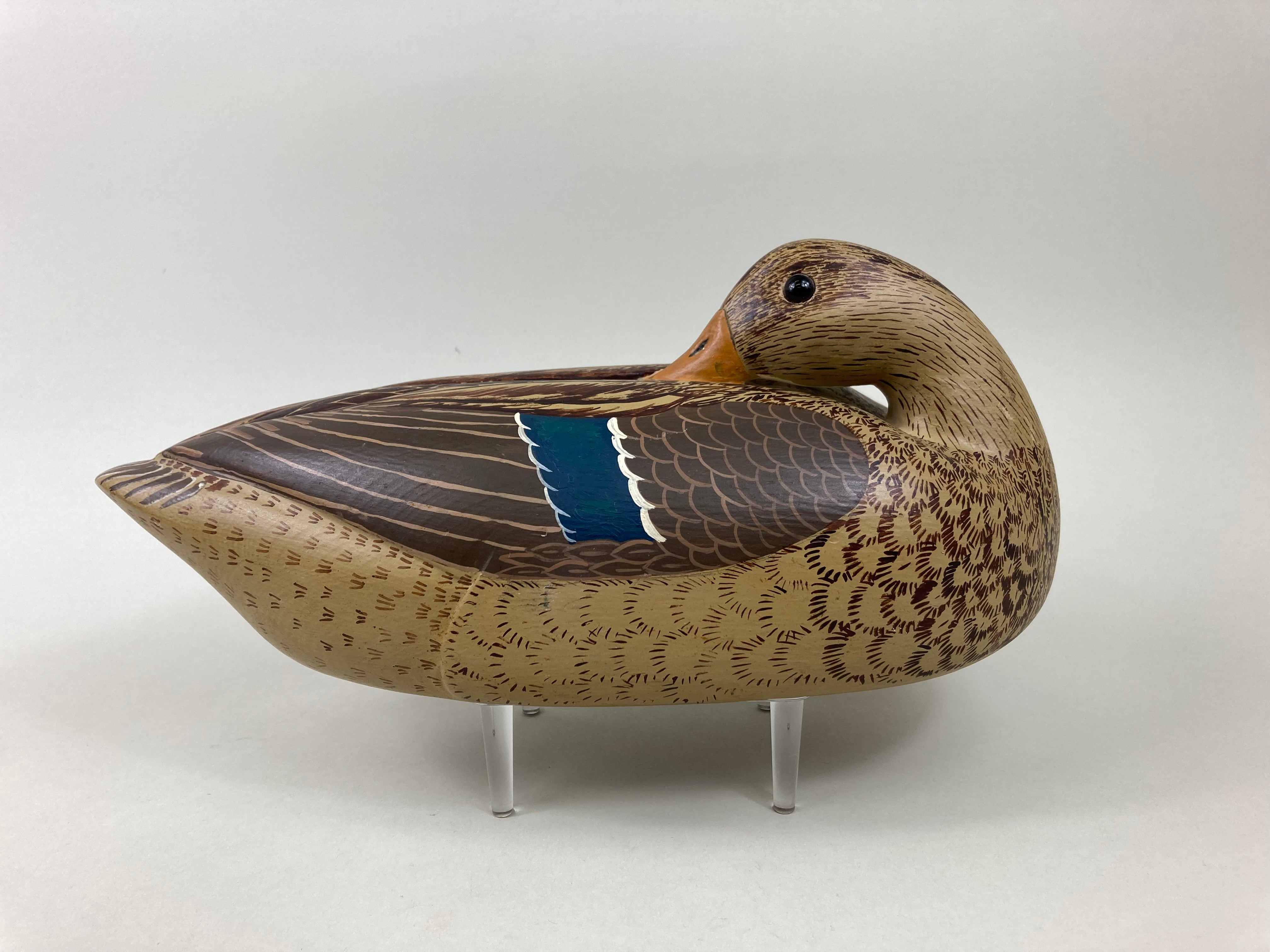 Wendell Sherman Preening Mallard Hen, Streator, Illinois. Glass eyes, hollow body, painted by R.L. Richardson in 1966, information written on bottom, slightly carved wings, very good condition. Decoy measures 13"...